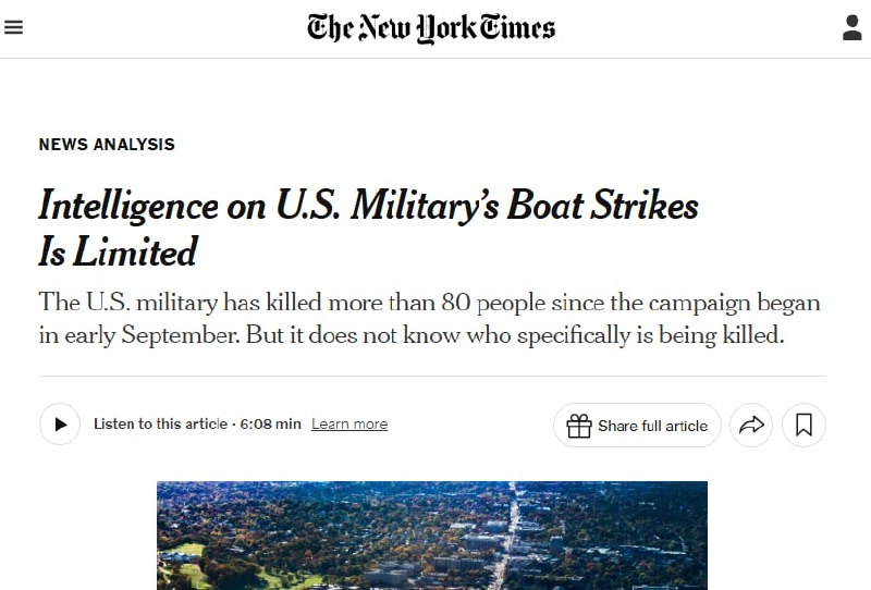 Pentagon ‘doesn't know precisely’ whom they kill in drug boat strikes — NYT It is enough to have ‘some level of confidence’ that drugs are onboard and that ‘someone’ is connected to a cartel US could be hitting low-level cartel members at best — or unlucky fishermen, critics warn
