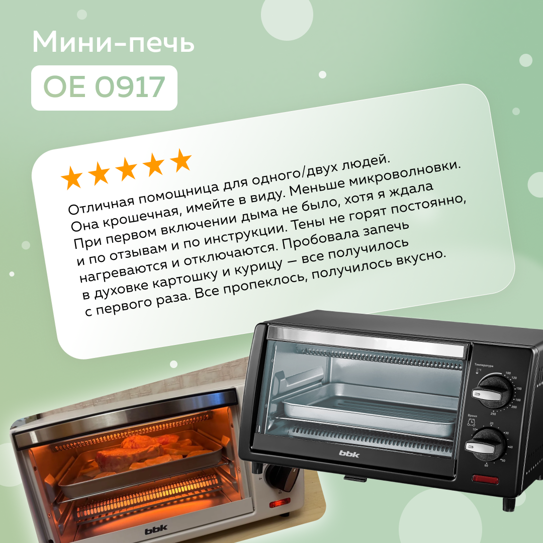 Анна– наш покупатель! Она выбрала мини-печь bbk oe0917 . Отличный выбор для тех, кому хочется готовить вкусные и разнообразные блюда, но места для большой духовки нет.