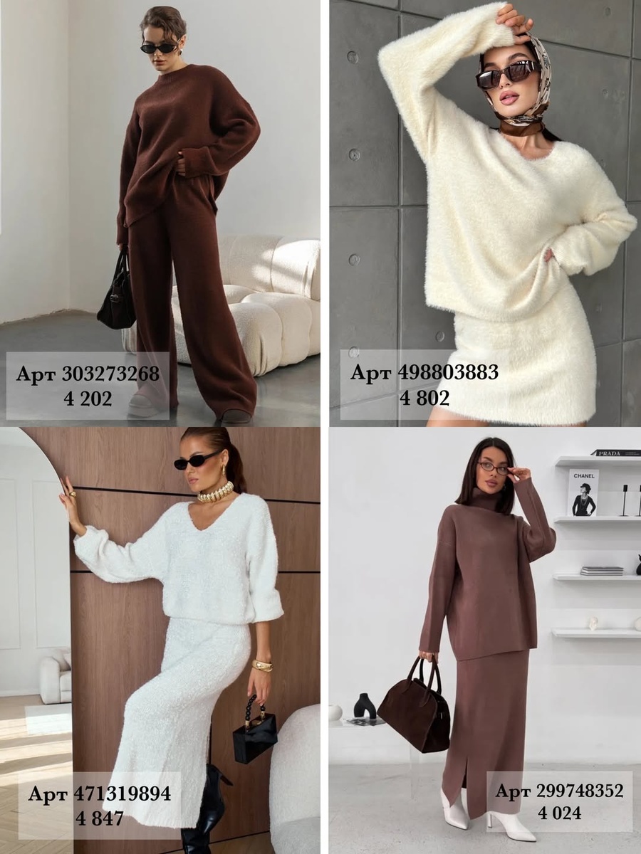 Зима — лучшее время для мягких силуэтов, уютных фактур и спокойных оттенков. Именно такие комплекты ты видишь на фото: вязаные костюмы, мягкие платья, объёмные свитеры и фактурные юбки. Они создают тот самый комфортный, дорогой и женственный образ, который хочется носить каждый день — от прогулок до офиса.