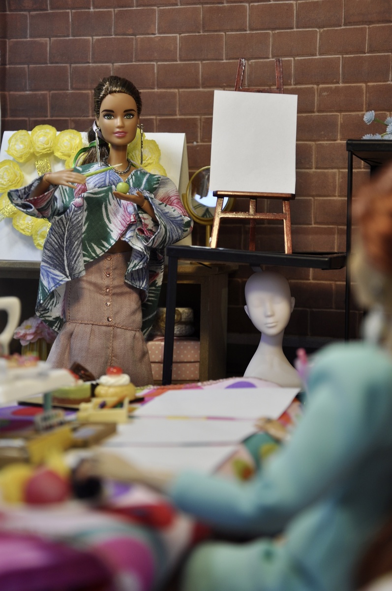 К этому моменту девушки закончили свои работы и принялись их демонстрировать. У Кристины получился вполне профессиональный портрет, ведь в юности она окончила художественную школу. Барби не решилась на изображение полуобнаженного натурщика и скромно продемонстрировала аккуратный акварельный этюд сочного зелёного яблока, а Руру, которая всё это время больше болтала, чем рисовала, представила забавную, но вполне узнаваемую карикатуру на своего товарища.