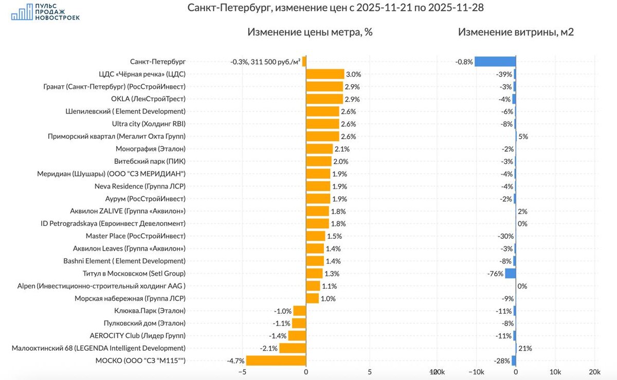 Санкт-Петербург, обзор изменения предложения на рынке за неделю💰 Смотрим без премиум и элит классов. 💵 За 7 дней цена метра снизилась на -0.3% до 311 500 рублей за метр. 📈Топ изменения цен (подорожало): 1️⃣ЖК "ЦДС «Чёрная речка»" (ЦДС) цена метра +3.0%, витрина предложения уменьшилась на -509м2 2️⃣ЖК "OKLA" (ЛенСтройТрест) цена метра +2.9%, витрина предложения уменьшилась на -906м2 3️⃣ЖК "Гранат (Санкт-Петербург)" (РосСтройИнвест) цена метра +2.9%, витрина предложения уменьшилась на -609м2 🪫Анти топ (подешевело): 1️⃣ЖК "МОСКО" (ООО "СЗ "М115"") -4.7% в цене, витрина предложения уменьшилась на -1054м2 2️⃣ЖК "Малоохтинский 68" (LEGENDA Intelligent Development) -2.1% в цене, объем витрины при этом увеличился на 75м2 3️⃣ЖК "AEROCITY Club" (Лидер Групп) -1.4% в цене, витрина предложения уменьшилась на -653м2 ☄️Объем предложения жилья в регионе ниже -0.8% (-10449 м2) Все изменения в регионе на картинке. ‼️Только для наших подписчиков в телеграмм - сервис истории цен для поиска в