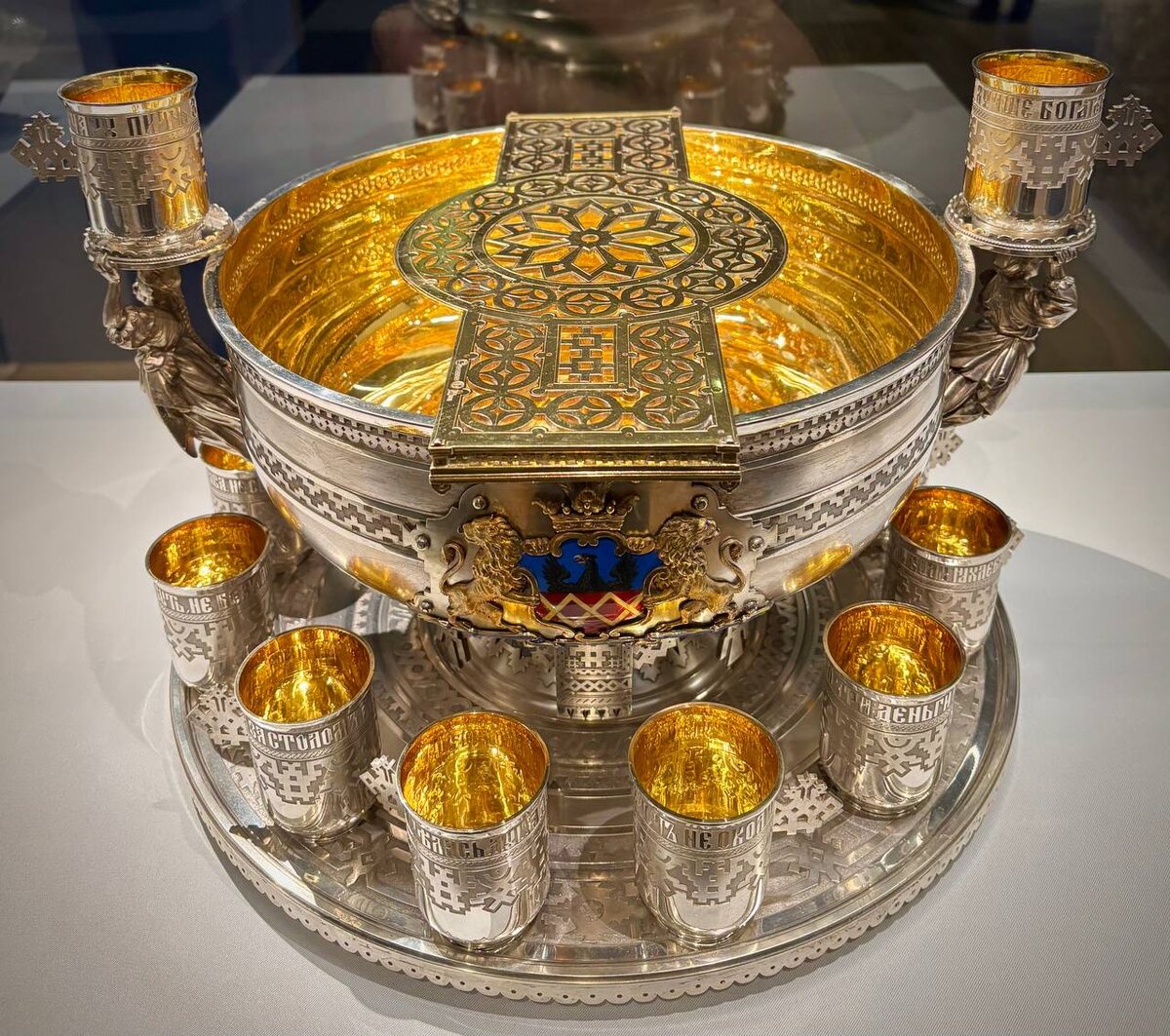 Пятничный контент подъехал 😃 Это, друзья мои, чаша (братина) для жженки с чарками фирмы Сазикова, которая сейчас пусть и не так известна как фирма Фаберже, но изделия у них тоже весьма хороши. Что же такое жженка? Настоящая алкогольная поэзия ❤️ Для ее приготовления требовалось несколько бутылок рома, коньяка или вина. Их вливали вот в такую чашу, добавляли апельсины и специи, на решетку сверху клали сахарную голову. Напиток поджигали и ждали пока сахар растает. Когда весь сахар оказывался в чаше, то этот поэтический напиток заливали шампанским для пущей рифмы. А затем неспешно потягивали из таких чарок. Хорошо? Великолепно! 🤩 Братину для жженки можно увидеть в Историческом музее на выставке, посвященной Царскому селу.