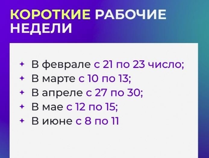 В 2026 году россиян ждут семь сокращённых рабочих недель. Сразу семь рабочих недель окажутся короче обычных из-за праздничных выходных и переносов. Короткие периоды ожидаются в феврале, марте, апреле, мае и июне. Ещё выходными станут 4 ноября и 31 декабря, поэтому в ноябре неделя будет разделена на две укороченные части, а в конце декабря россиян ждут всего три рабочих дня Источник: Кушвинская Правда Источник: Открыть