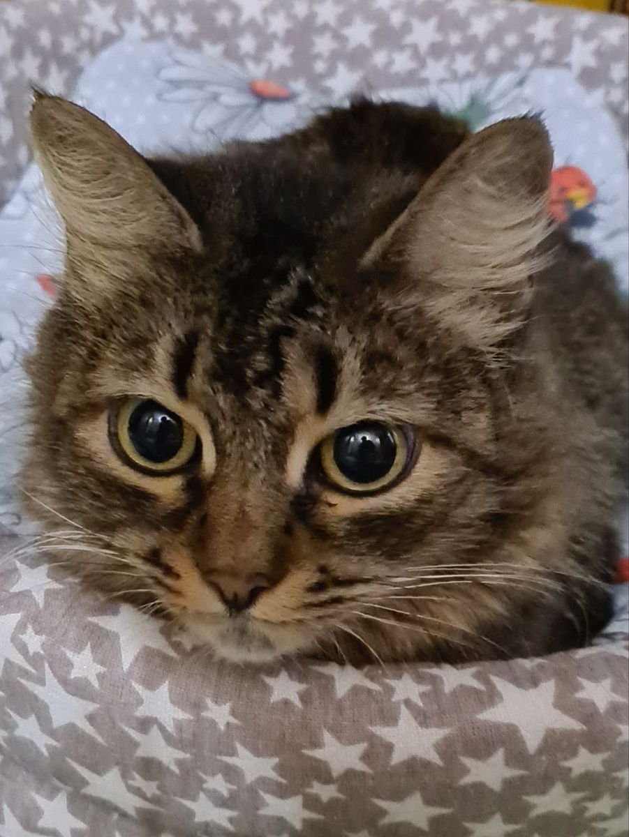 А между тем у нас уже совсем оправилась от стерилизации красивая усатая девочка, наша внезапная лапочка, дрожавшая в мокрых кустиках в сентябре. Посмотрите на неё, настоящая Сова же! У неё такие огромные говорящие глаза! В них вся её нелёгкая жизнь, о который мы, увы, ничего не знаем. Ясно только одно: девочка точно была домашней, она очень ласковая и совершенно спокойно реагирует даже на незнакомых людей. Но люди предали ее. Сначала пичкали гормональными таблетками во время течек, отчего у девочки развилась пиометра, эндометриоз и многочисленные кисты, потом и вовсе выгнали на улицу. И если бы Лариса случайно не нашла её в сентябре, кошка совсем скоро погибла бы, ей не удалось бы пережить осень. Сова была худенькой и печальной. Но теперь у неё всё будет хорошо. У Ларисы она отлично подружилась с белорусской Музой, местной Ночкой и её детьми Угольком и Бусинкой. Хорошая, неконфликтная, дружелюбная к сородичам кошка, адекватная со всех сторон, легко уживается и с людьми, и с другим