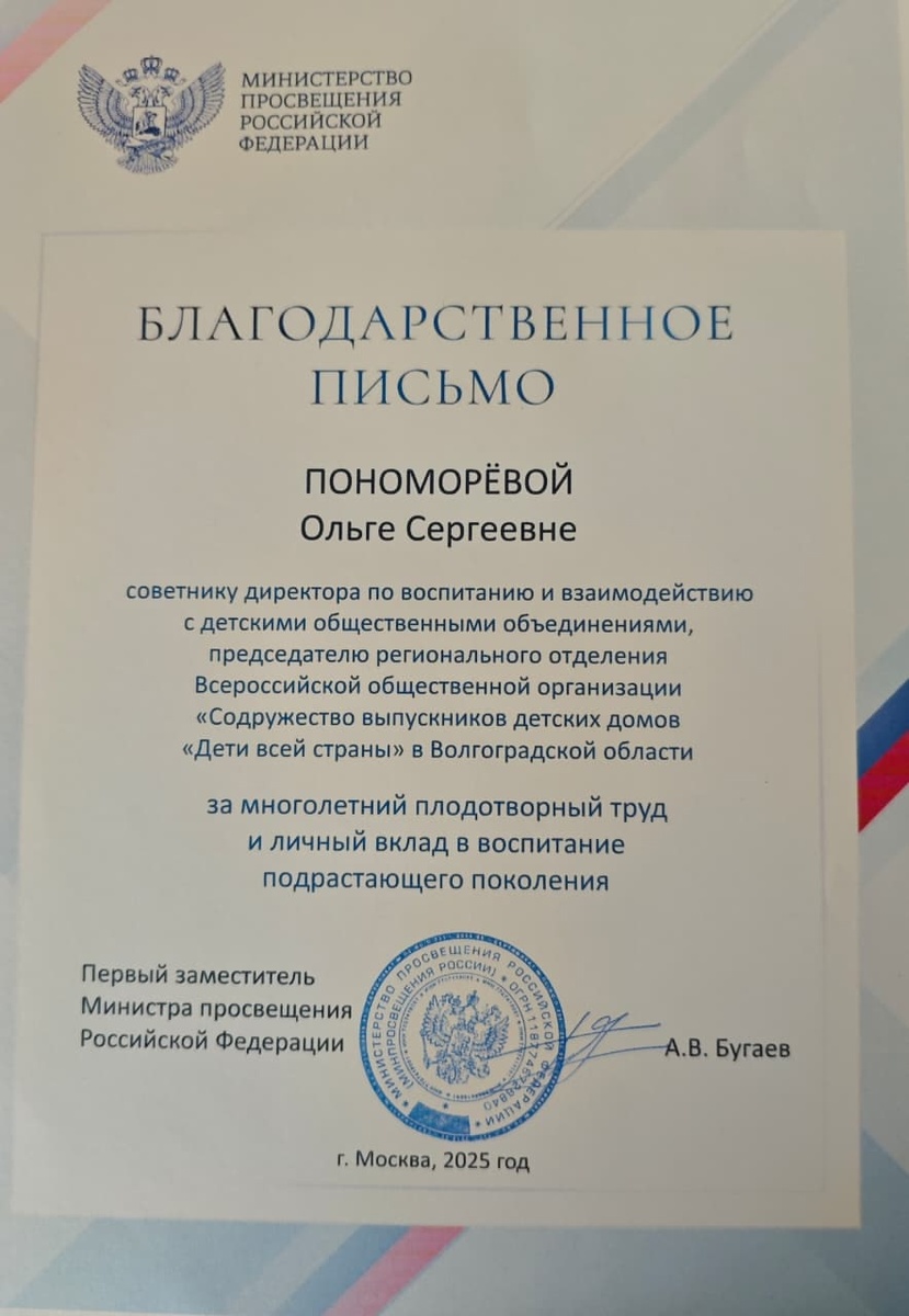 За многолетний плодотворный труд и личный вклад в воспитание подрастающего поколения Ольга Сергеевна, советник директора по воспитанию и взаимодействию с детскими общественными объединениями ВФ РГУ СоцТех, председатель регионального отделения Всероссийской общественной организации «Содружество выпускников детских домов «Дети всей страны» в Волгоградской области, удостоена благодарности!