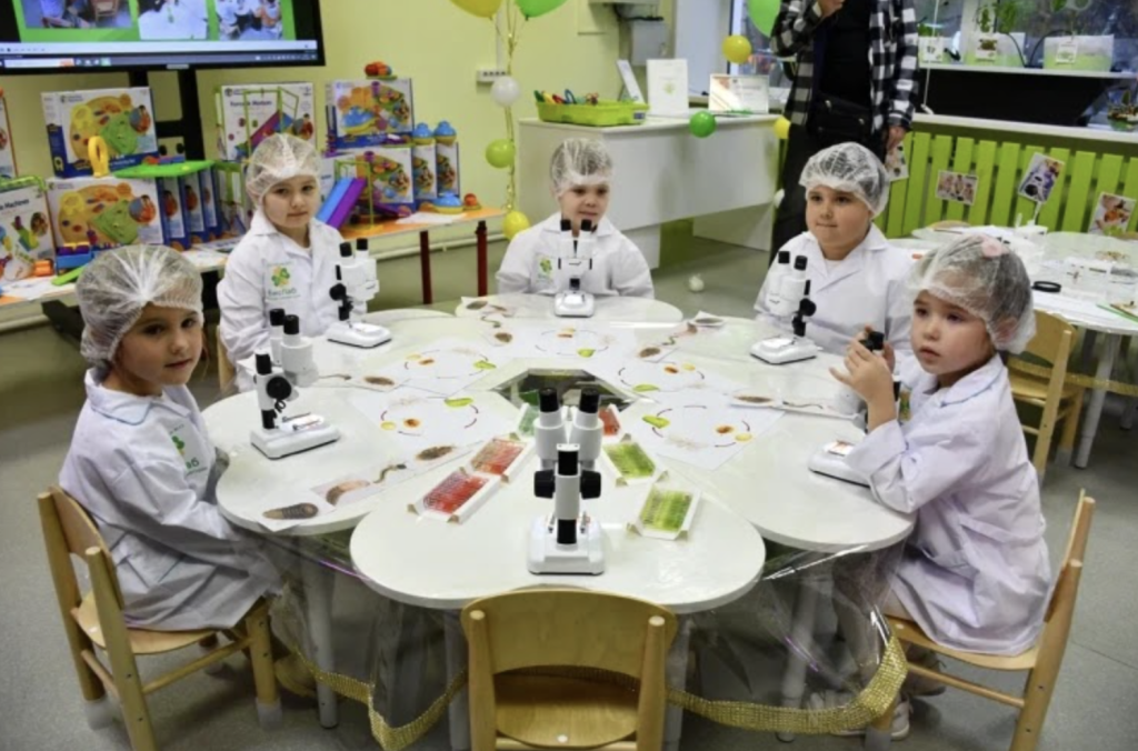 В лаборатории для детей есть микроскопы для изучения микроорганизмов и природных