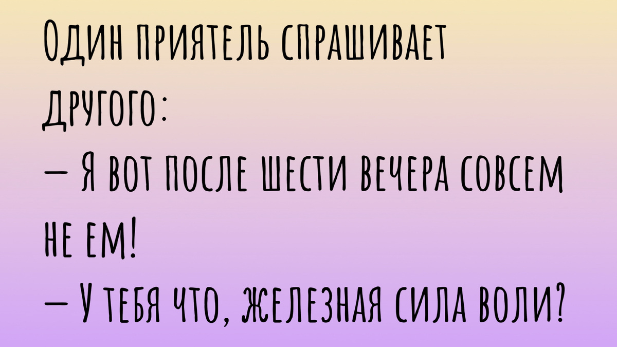 Ах, эта знаменитая фраза "не ем после шести"! Сколько надежд она породила, сколько диет началось и закончилось... но наш герой, кажется, нашел свой уникальный способ трактовать это правило. Это не сила воли, это скорее логистическое планирование! Шесть порций — это вам не шутки, это целая стратегия насыщения, которая позволяет обойти любые запреты. Ведь если ты уже съел шесть порций, то технически ты действительно не ешь после них. Гениально, не правда ли? Возможно, он даже разработал свою собственную систему измерения порций, где одна порция — это целая пицца, а "шесть" — это просто магическое число, открывающее двери в мир неограниченного наслаждения едой, но строго до наступления абстрактного "после шести". А мы-то думали, что это про ограничение!
