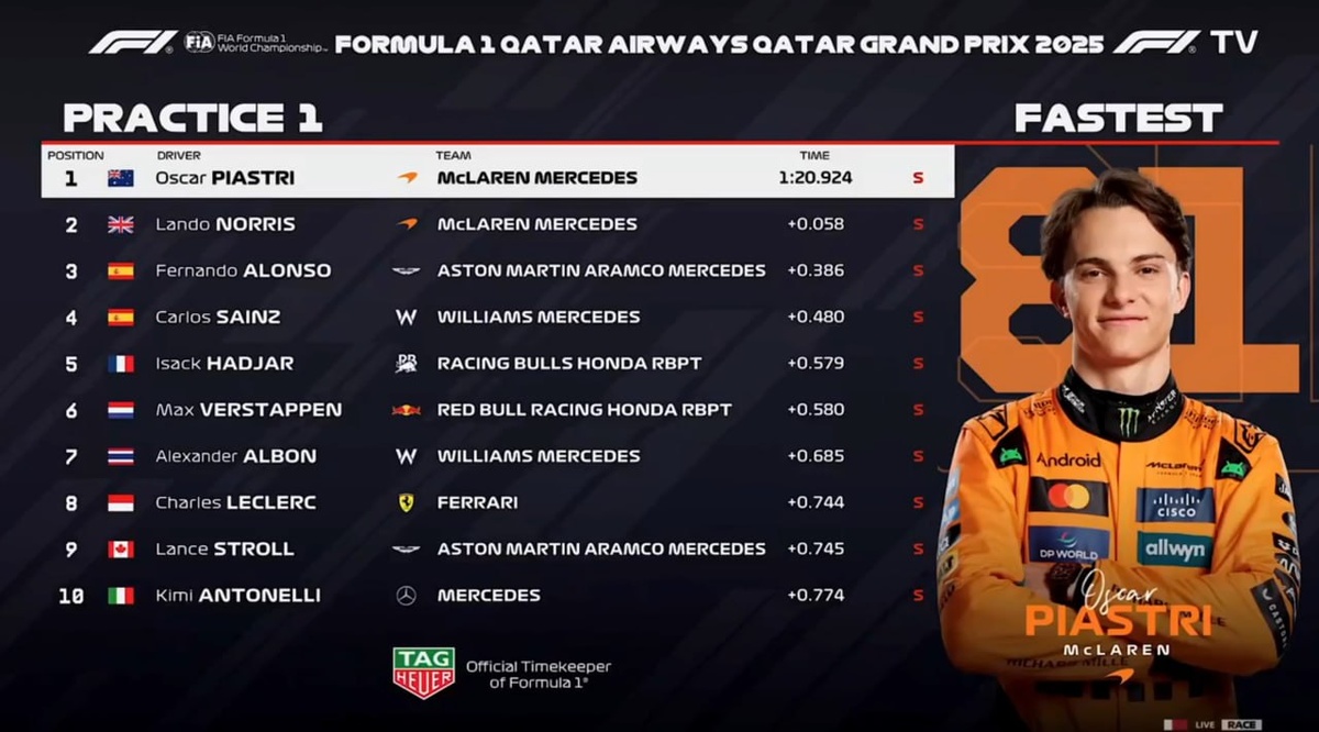 Результаты практики гран-при Катара: Пиастри со второй попытки смог поставить лучшее время, Норрис и Ферстаппен своё время поставили с первой попытки. Макс после одного быстрого круга сразу ушёл в питы: видимо, команда оказалась не сильно довольна настройкой машины, так как в итоге он выехал после этого только на тренировку старта.