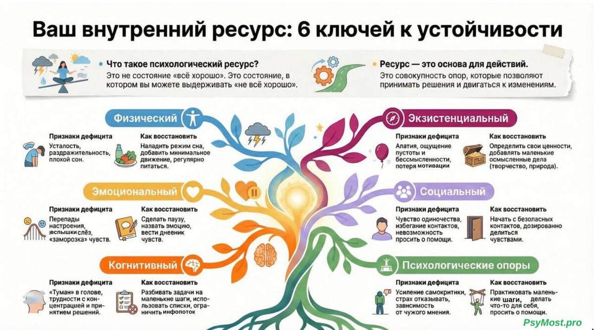 Друзья, часто, работая в высокой нагрузке, мы удерживаем пространство для других, но при этом собственное восстановление откладвваем. Со временем это снижает чувствительность, повышает усталость и незаметно истощает ресурс — тот самый, на котором строится фундамент нашей жизни. О ресурсе и почему он важен мы писали здесь 👉 читать. https://t.me/psymostpropsy/190 Именно поэтому мы подготовили для вас небольшую памятку по восстановлению ресурса. При оформлении памятки мы использовали метафору дерева, как символа роста и жизни. Информация в памятке изложена в формате ОЩУЩЕНИЕ ➡️ ДЕЙСТВИЕ. Выбираете то, что чувствуете, изучаете, как можно себе помочь. Мы решили выпустить памятку в понедельник не случайно. Понедельник часто формирует тон всей недели: уровень вовлеченности, качество решений, ощущение ненапрасности. И наша идея при составлении памятки была сделать так, чтобы первый день начался не на силе воли, а с комфортного вхождения в рабочий ритм, с опорой на собственный ресурс. Рас
