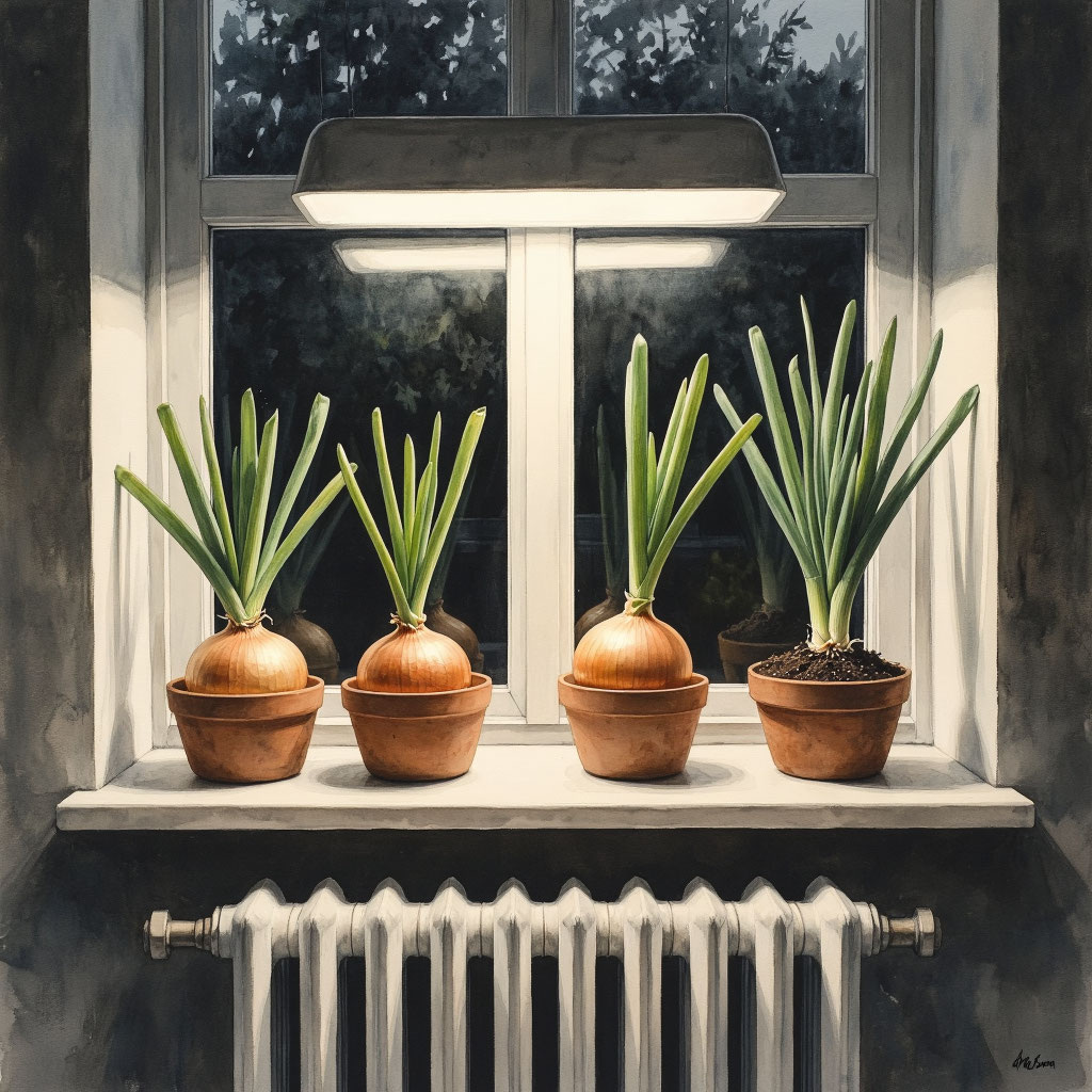 Каждый год в декабре кто-то ставит луковицу в стакан, сажает укроп в йогуртовый стаканчик, и к Новому году получает либо плесень, либо жалкие ростки. Это происходит, потому что никто не объяснил простое: зелень на подоконнике — это растения, которым нужны три вещи: свет, правильная почва и умеренный полив. И если дать им это, они вырастут даже в ноябре, даже на северном окне, даже у того, у кого и кактусы не выживают. Главное — избегать перегрева и сухого воздуха. Батареи сушат воздух, а прямой жар от горячего подоконника обжигает корни. Если у вас батарея под окном, поставьте горшок на деревянную подставку или толстую книгу. Это создаст воздушный зазор. Свет — ключевой фактор. На южном или восточном окне можно обойтись без ламп. На северном или западном понадобится светодиодная фитолампа полного спектра (продаётся в садовых магазинах, стоит от 300 рублей). Включайте её на 3–4 часа вечером (с 17:00 до 20:00). В пасмурные дни можно и днём. Горшок должен быть обязательно с дренажными отв