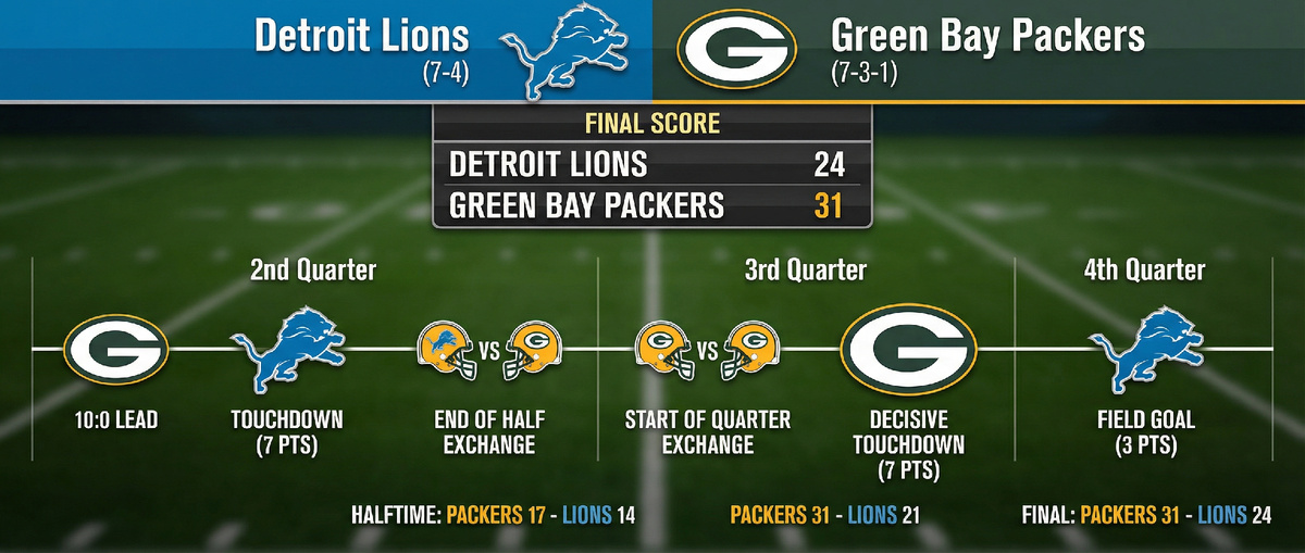В самом начале второй четверти Пэкерс вели уже 10:0, но Детройт вскоре "размочил счёт" тачдауном. Под занавес половины команды обменялись тачдаунами и ушли на перерыв при 17:14 в пользу "упаковщиков". Старт третьего отрезка и вновь обмен тачдаунами. А в конце четверти решающее действие от Грин-Бэй - снова семь очков в их копилку. Лайонз в четвертой четверти ответили лишь филдголом и поиграли 24:31.