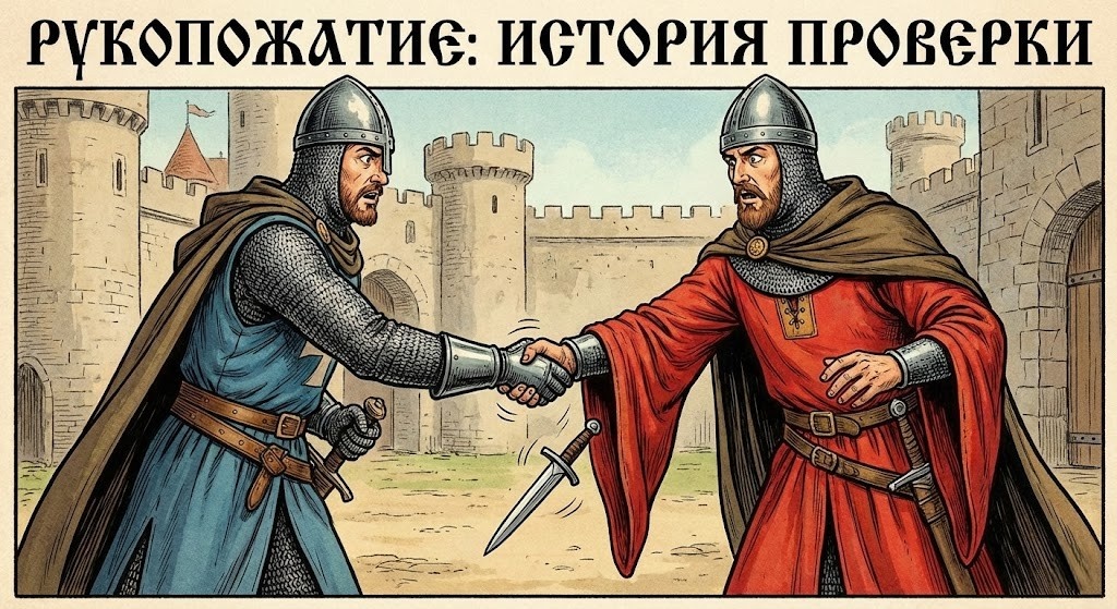 Вы заходите в офис, видите коллегу, протягиваете ему правую руку, сжимаете его ладонь и делаете несколько легких взмахов вверх-вниз. «Привет!». Это действие доведено до автоматизма. Мы считаем рукопожатие знаком уважения, доверия и мужской дружбы. Но если бы вы попали в Средневековье и не сделали этого при встрече с незнакомцем, вас могли бы проткнуть мечом на месте. Потому что изначально рукопожатие было не приветствием, а досмотром на наличие оружия. Шаг 1. «Я не держу камня» Традиция показывать открытую ладонь — самая древняя. Она появилась еще в античные времена (изображения рукопожатий находят на греческих амфорах 5 века до н.э.). Логика проста: большинство людей — правши. В правой руке держат меч, нож или камень.