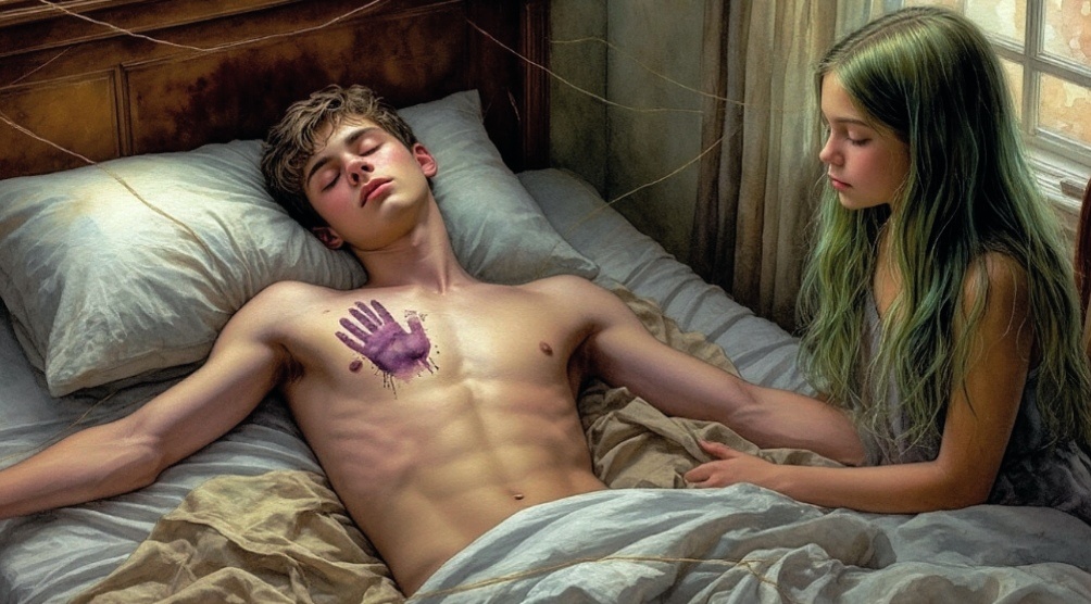 Сýрка в это время стояла и, как заворожённая, смотрела на капельки золотистого цвета, которые достаточно ловко бежали к груди Максима и исчезали в центре большого фиолетового пятна.