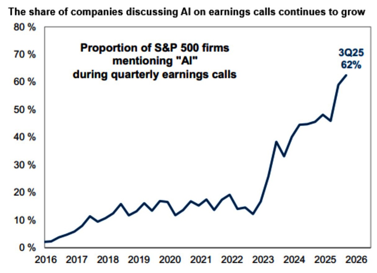 На фондовом рынке сформировалось новое правило: хочешь, чтобы капитализация росла — говори про искусственный интеллект. Свежие данные показывают, что уже 62% компаний из S&P 500 упоминают AI на своих квартальных созвонах — и доля стремительно растёт. Ещё в 2022 году это делали меньше 20% компаний. Причина проста: рынок награждает любые намёки на ИИ повышением внимания, пересмотром прогнозов и ростом ожиданий по будущей прибыли. Инвесторы считают, что компании, вовремя встроившиеся в AI-тренд, будут выигрывать в продуктивности, марже и конкурентоспособности. Поэтому достаточно одного упоминания «мы интегрируем AI» — и котировки зачастую реагируют быстрее, чем сами продукты появляются в реальности.