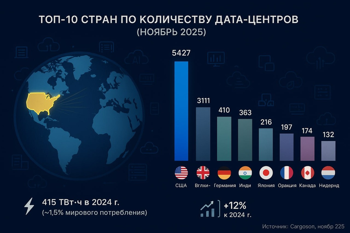 Топ‑10 стран по количеству дата‑центров Согласно рейтингу Cargoson, в мире активно растёт число дата‑центров, необходимых для обслуживания цифровых сервисов, облачных технологий и искусственного интеллекта. На ноябрь 2025 года лидером остаются США. Рейтинг стран по количеству дата‑центров выглядит следующим образом: 1. США - 5427 2. Германия - 529 3. Великобритания - 523 4. Китай - 449 5. Канада - 337 6. Франция - 322 7. Австралия - 314 8. Нидерланды - 298 9. Россия - 251 10. Япония - 222 Дата‑центры потребляют значительную часть мировой электроэнергии: в 2024 году они использовали более 415 тераватт-часов, что составляет около 1,5% мирового потребления. Дата‑центры обеспечивают стабильную работы цифровых сервисов и облачных платформ, косвенно влияют на развитие экономики и отражают инвестиционную привлекательность рынков (без учета политических факторов).
