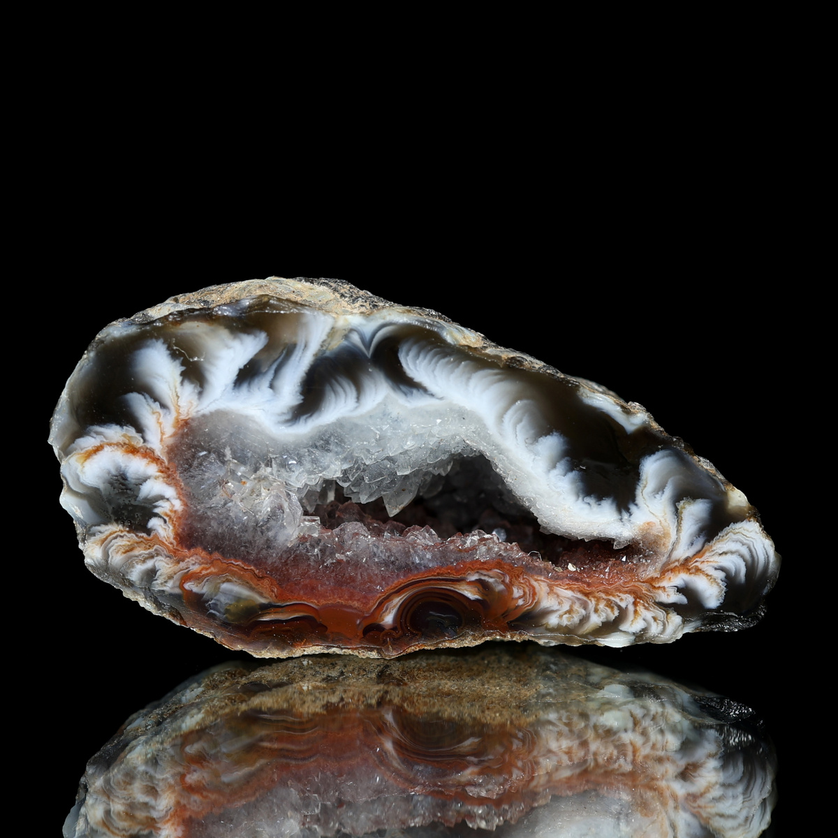Вместо классического полосатого узора видим "перья", по которым агаты и получили своё торговое название. Внутри у таких камней обычно кристаллы кварца, реже можно встретить аметист, как на фото ниже Основной регион — юг Бразилии, базальтовые породы. Этот регион вообще известен агатами и аметистовыми жеодами.
