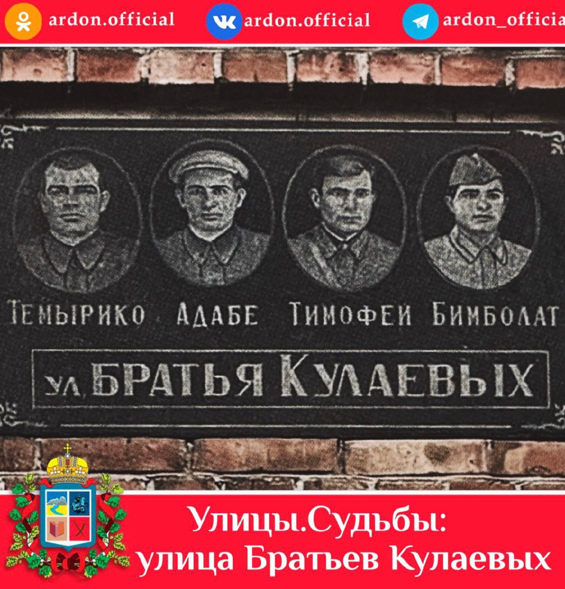 «Улицы.Судьбы: Истории людей, чьи имена увековечены на улицах, площадях и скверах города Ардона». 📍Улица Братьев Кулаевых Все дальше в историю уходят события Великой Отечественной войны, но не тускнеет человеческая память. Победа, одержанная нашими отцами и дедами, объединяет нас всех и напоминает нам о том, как ценен мир и как с годами не проходит боль за погибших родных. За все годы войны не было ни одного сражения, в котором бы не участвовали сыны многонационального народа Осетии. С первых дней войны в героический строй защитников Родины встали и пять братьев Кулаевых, но только одному из них суждено было вернуться домой. Летом 1941 г. Ардонским райвоенкоматом первым на фронт был призван Темирболат. За ним оставили родной очаг Касполат и Адабе. Немного позже родители проводили на войну Бимболата и Тимофея, с тревогой ожидая новостей от своих сыновей. От Тимофея пришло письмо: «Дорогие мои, не сомневайтесь, победа будет за нами. Прогоним врага, разобьём их, и мы снова будем вме