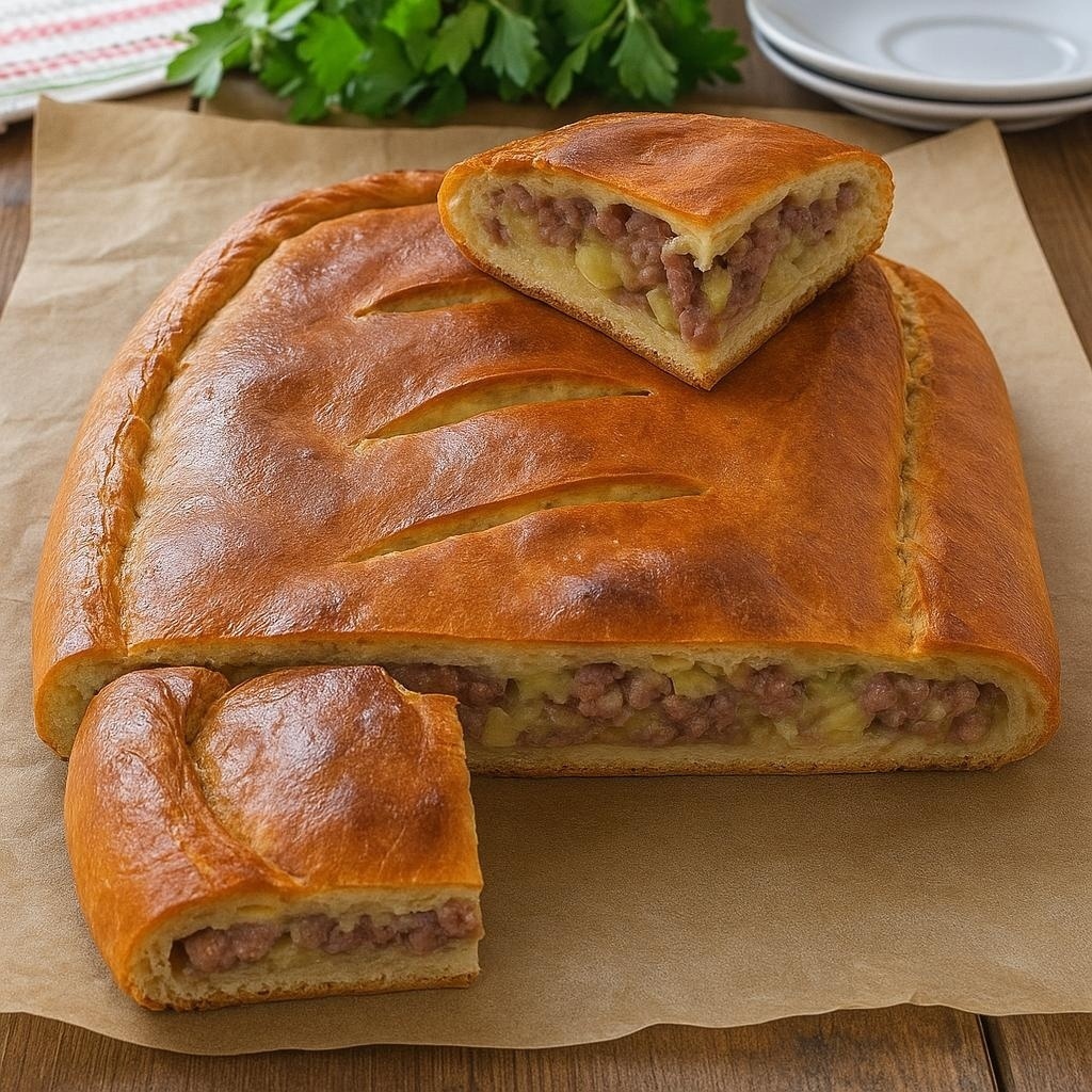 Сытный, ароматный пирог с мягким тестом и сочной мясной начинкой — отличный вариант к ужину или для пикника. Готовится просто, а результат радует всех! ИНГРЕДИЕНТЫ: Для теста: ✅ Кефир — 250 г ✅ Яйцо — 1 шт. ✅ Сливочное масло (растопленное) — 50 г ✅ Разрыхлитель — 1 ч.л. ✅ Соль — 1 ч.л. ✅ Мука — 450 г (частично можно использовать цельнозерновую) Для начинки: ✅ Рубленая говядина (или любой фарш) — 400 г ✅ Картофель — 250 г ✅ Лук — 1 большая головка ✅ Соль, перец — по вкусу ✅ По желанию — кусочки сливочного масла для сочности ПРИГОТОВЛЕНИЕ: 1. Замешивание теста: Смешать кефир, соль, яйцо и растопленное масло. Добавить просеянную с разрыхлителем муку, замесить мягкое тесто. Накрыть миской, дать немного постоять. 2. Начинка: Говядину смешать с мелко нарезанными картофелем и луком. Посолить и поперчить по вкусу. При желании добавить кусочки масла. 3. Сборка пирога: Разделить тесто на 2 части (одна немного больше). Большую раскатать в прямоугольник 33×26 см, выложить на противень с