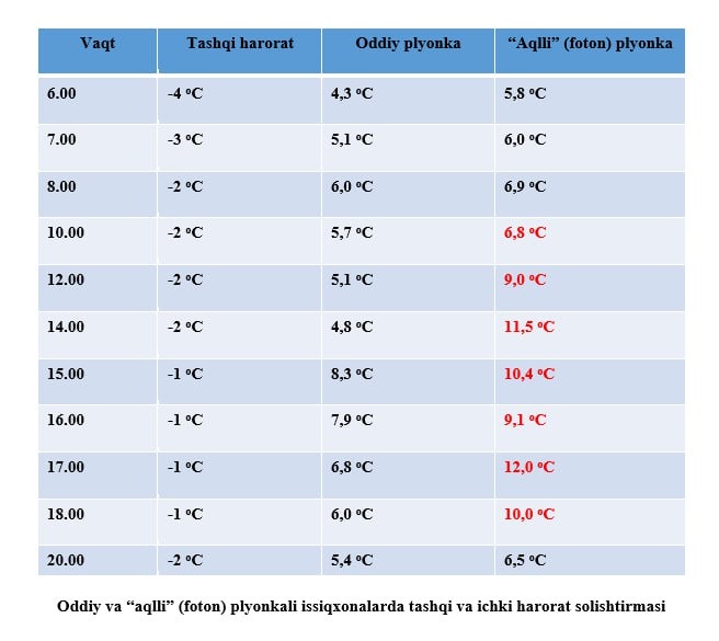 #янгилик Олимлар ёқилғисиз экоиссиқхоналарни таклиф қилмоқда ЎзФА Материалшунослик институти олимлари иссиқхоналарни ҳеч қандай ёқилғи ишлатмасдан ва ҳавога чиқиндисиз иситишга имкон берувчи технологияни тақдим этди. Иссиқхона плёнкаларига мўлжалланган нанокомпозит заррачалар қуёш нурини “ақлли” иссиқликка айлантиради ва иссиқхона ичидаги ҳароратни а тартибга солишга ёрдам беради. Ушбу заррачалар кучли ултрабинафша нурини юмшоқ инфрақизил нурга айлантиради, бу эса тупроқ ва ҳавони самарали иситади. Иссиқхоналарда ўтказилган синовлар шуни кўрсатдики: • Ташқи ҳарорат –3…–7 °C бўлса ҳам, янги плёнкали иссиқхонада ички ҳарорат барқарор +5…+7°C ни ташкил қилади (оддий плёнкалар билан 0…+2 °C), • Қишда қўшимча иситишсиз ёки минимал иситиш билан ишлаш имконини беради, • Ёзда иссиқхона ичидаги ҳарорат 6–9 °C пастга тушади, бу ўсимликларни ортиқча қизиб кетишдан ҳимоя қилади ва стрессни камайтиради. Каналимизга обуна бўлинг ва сўнгги янгиликларни кузатиб боринг Jizzaxnews |Тelegram | Fac