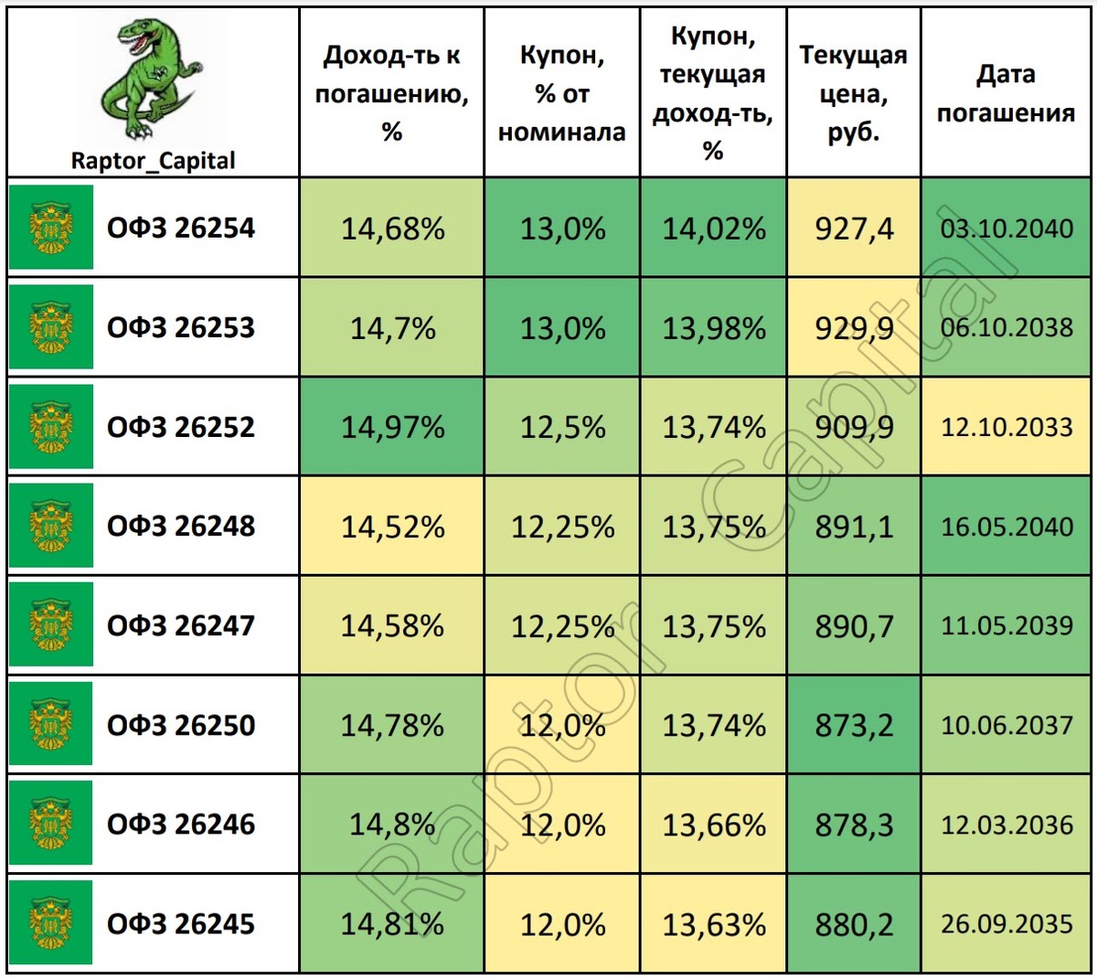📌 Сегодня предлагаю посмотреть, какую безрисковую доходность предлагают длинные ОФЗ. Взглянем на три новых выпуска и посчитаем, сколько удастся заработать в ОФЗ с горизонтом 1 год. • Прогноз ЦБ допускает ключевую ставку 14% на конец 2026 года. Сейчас это можно назвать довольно пессимистичным сценарием, но если он реализуется, то из ОФЗ с постоянным купоном с прицелом на 1 год выгоднее те выпуски, в которых выше купонная доходность. В таблицу поместил все ОФЗ с самыми большими купонами, у всех выплаты купонов 2 раза в год. • Самая высокая купонная доходность сейчас у двух новых выпусков: 26254 (ставка купона 13%, текущая купонная доходность 14,02%) и 26253 (ставка купона 13%, текущая купонная доходность 13,98%). • Если всё же цель – самая высокая доходность к погашению, то здесь лидирует ещё один новый выпуск 26252 (доходность к погашению 14,97%), но у него самое раннее погашение (2033 год). Самый длинный срок погашения у выпусков 26254 и 26248 (2040 год). • С каждым снижением ключевой