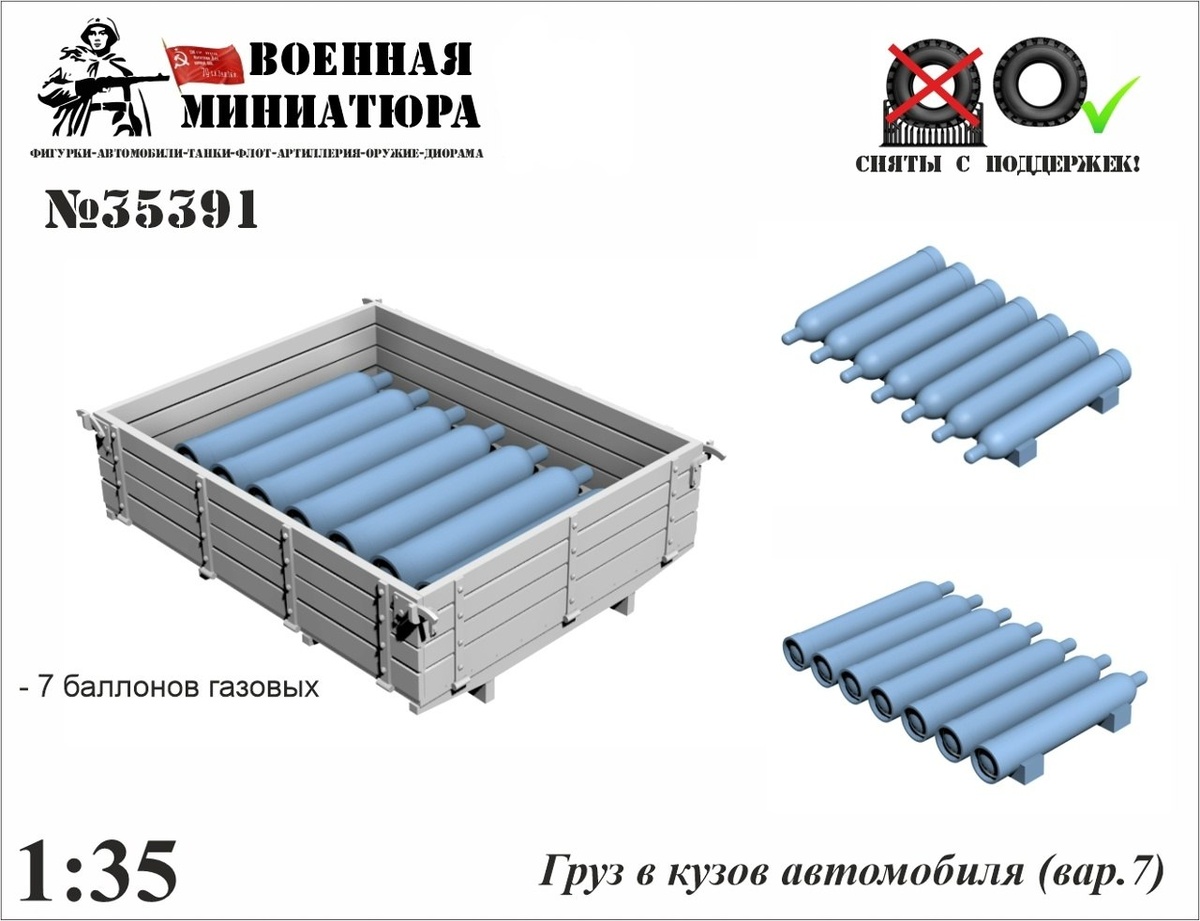 "Военная миниатюра" из Ставрополя скорректировала груз баллонов для кузова грузовика, выпускаемый в масштабе 1/35 на 3D-принтере - баллоны получили колпаки и упоры для перевозки в кузове, размещены в кузове согласно требованиям безопасности, вентилями к правому борту.
