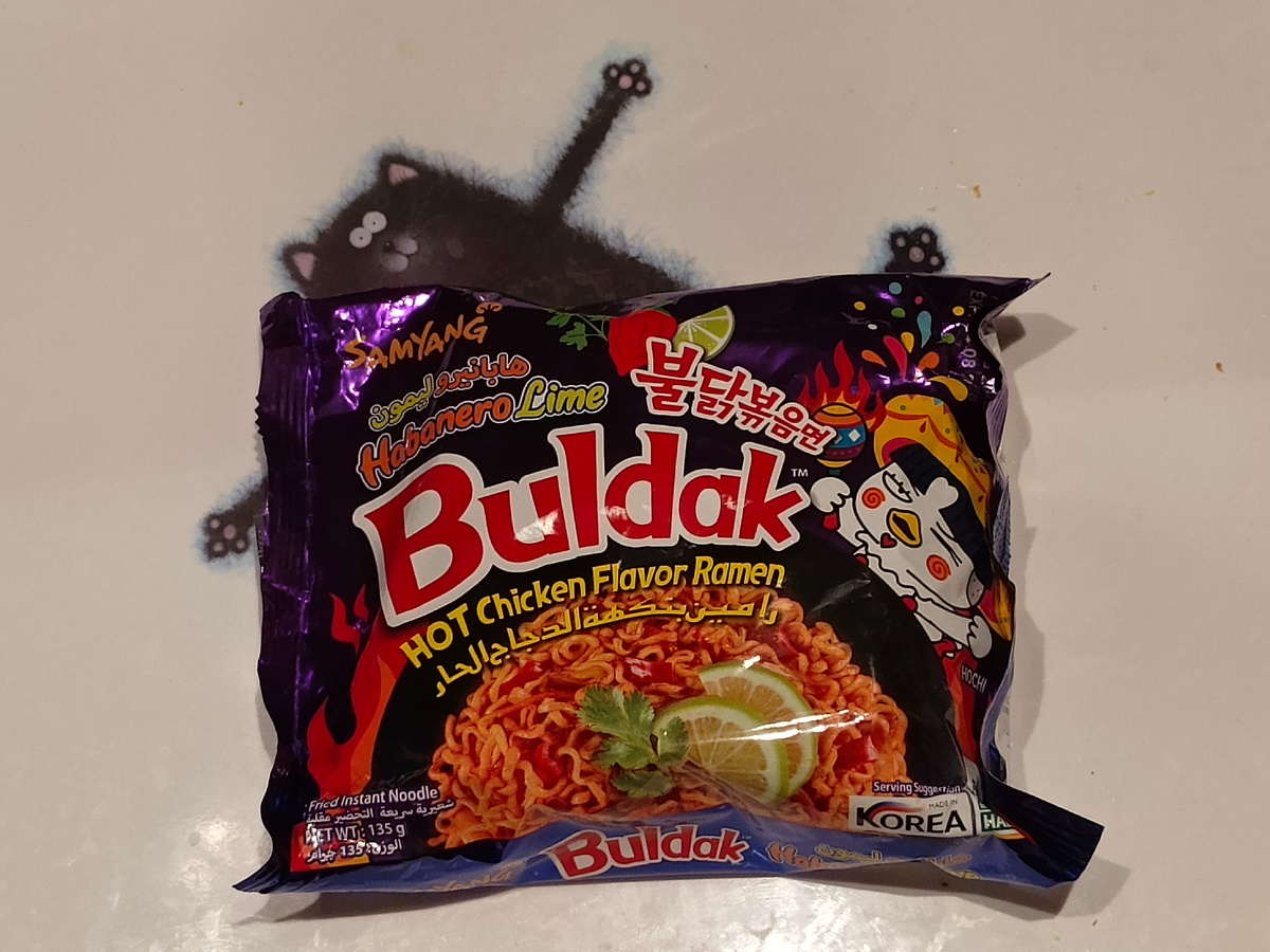 Купила за пятёрку в Дубайске по приколу — утром распаковала понеслось... Захотелось горячей курочки? Всего три ингредиента! Немного сушёных. В одном пакетике сушёные овощи, в другом ацкий острый соус. Ну, обещали такой. Закидываю лапшу в бульон — на фотке видно, что чья-то волосня затесалась в рецепт! Не моя! Я блондинко!! Видимо, индийская рецептура... Сварено, употреблено. Штош!! На мой суровый вкус — 8 из 10. В связи с тем, что я постоянно употребляю острое, эта лапша — ну норм. Хотя сама лапша довольно пухлая, ничего в себя не впитала — вкус был только в бульоне. Что ещё такого попробовать??