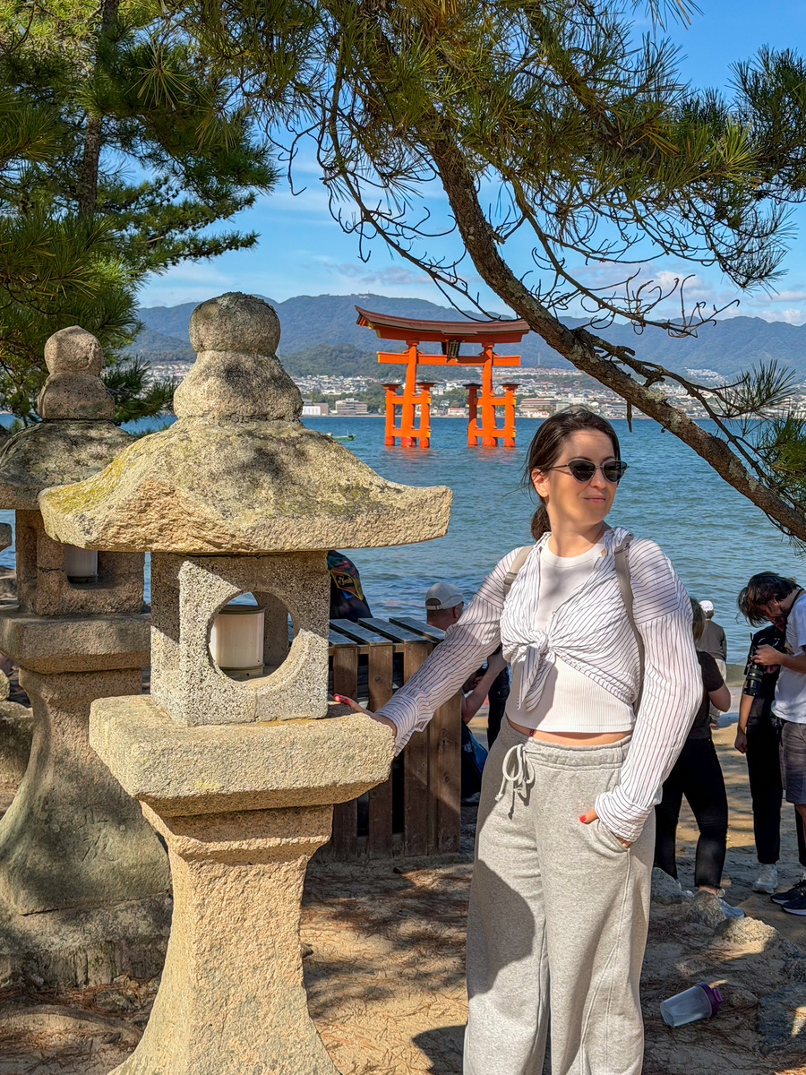 Храм Ицукусима – это одно из тех мест, которые кажутся не обычными. Весь его комплекс будто парит над водой, поддерживаемый древними сваями. Зрелище, конечно, великолепное. Вход в сам храм платный – 300 йен и туда прям огромнааааая очередь. Сразу говорю, мы не стали стоять в этой очереди и решили обойтись лицезрением храма со стороны. Однако, подлинным символом этого места, конечно, являются огромные ворота-тории, которые обозначают переход от мирского к священному пространству. Они стоят поодаль от храма, прямо в заливе. Их ярко-оранжевый цвет контрастирует с лазурью воды и зеленью гор на заднем плане. Мы попали к воротам во время прилива, а вот во время отлива к ториям можно подойти пешком. Красота невероятная! Это одни из самых узнаваемых ворот в Японии и они есть на многих сувенирах. И часть открыток, которые я привезла для вас, как раз с острова Миядзима с ториями.