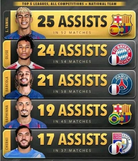 Игроки топ-5 лиг Европы с наибольшим количеством результативных передач в 2025-м году Ямаль на первом месте, даже несмотря на слабую весну прошлого сезона и еще менее убедительную осень сезона 25/26 Ламин Ямаль: 25 голевых передач в 52 матчах за ФК «Барселона» и сборную Испании. Майкл Олисе: 24 голевые передачи в 54 матчах за ФК «Бавария» и сборную Франции. Брэдли Барколя: 21 голевая передача в 58 матчах за ФК «Пари Сен-Жермен» и сборную Франции. Рафинья: 19 голевых передач в 45 матчах за ФК «Барселона» и сборную Бразилии. Райан Шерки: 17 голевых передач за ФК «Олимпик Лион» и сборную Франции. Отметим доминирование игроков французской сборной. А ведь у них на флангах еще могут сыграть Дуэ, Дембеле, Коман. ⚽️ Подписывайтесь на нас в MAX