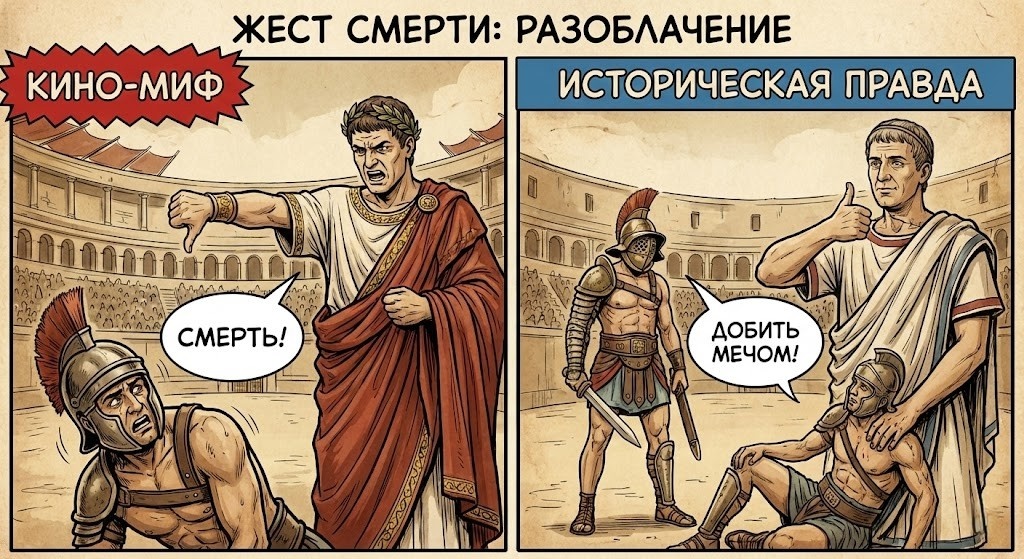 Вспомните любой фильм про Древний Рим. Финал битвы на арене. Поверженный гладиатор лежит в пыли, победитель приставляет меч к его горлу и смотрит на императора. Толпа ревет. Император медленно вытягивает руку и… поворачивает большой палец вниз. Смерть! Зал выдыхает. Красивая сцена? Безусловно. Историческая правда? Нет, это полная ложь. Если бы реальный римский гладиатор увидел жест «палец вниз», он бы, скорее всего, просто не понял, чего от него хотят, или расценил это как призыв бросить оружие. Сегодня на канале «Точно не знали» разбираемся, как одна картина 19 века обманула весь мир. Этот миф так прочно засел в наших головах, что даже Ридли Скотт (режиссер культового фильма «Гладиатор») не стал проверять факты. Всё началось не с летописей, а с картины французского художника Жана-Леона Жерома, написанной в 1872 году. Она так и называется — Pollice Verso («Палец вниз»). На ней изображены зрители Колизея, яростно тычущие большими пальцами в землю, требуя добить бойца. Кинематографисты н