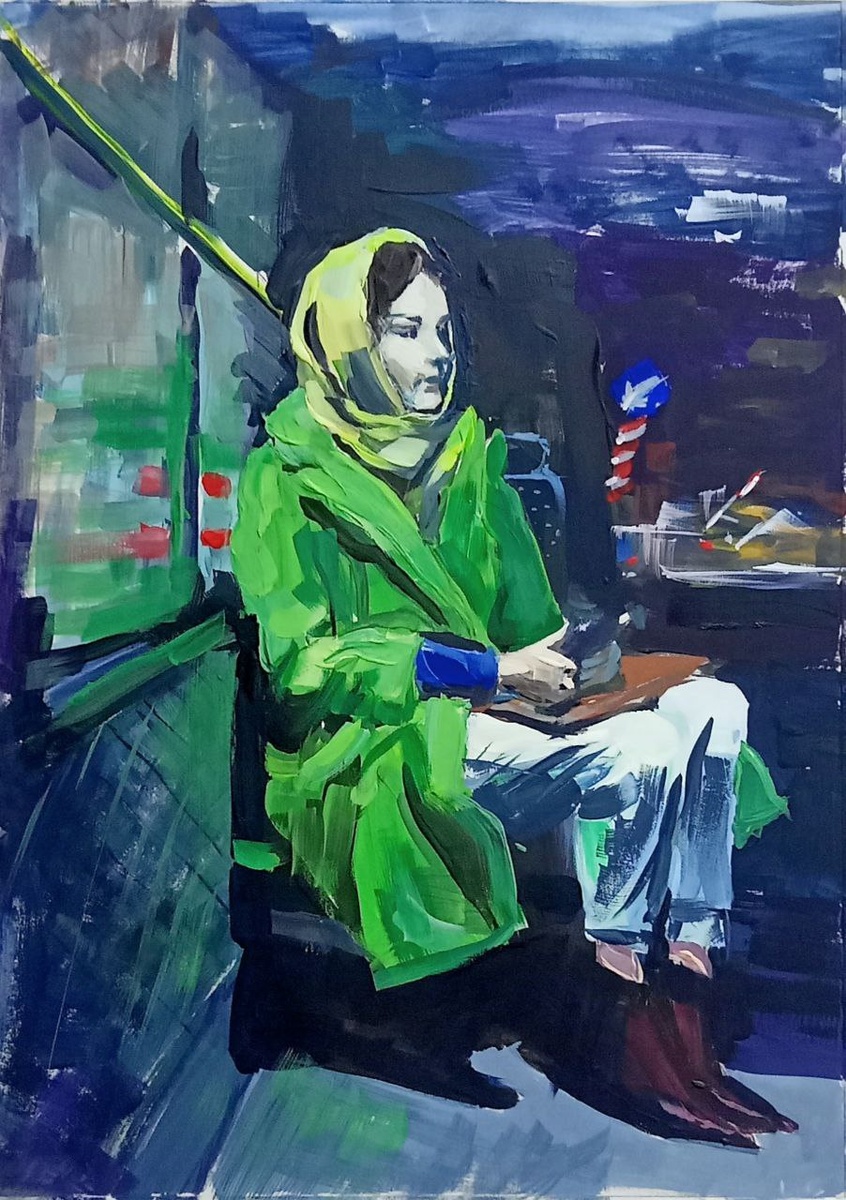 Как человек воспитанный, я понимаю, что пялиться на пассажиров в маршрутке нехорошо. Но как художник, я себе не прощу, что из вежливости пропустила такой чудесный образ - это зелёное пальто меня пленило💚💚💚 Девушка в зелёном пальто, гуашь, картон #осень #девушка #маршрутка