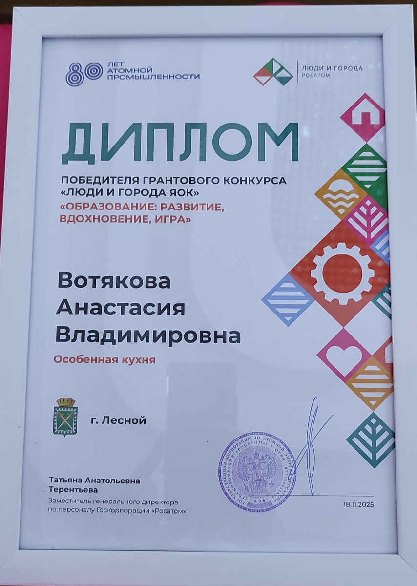 Здравствуйте, дорогие подписчики! Хочу поделиться с вами большой радостью — мой проект «Особенная кухня» стал победителем грантового конкурса #люди_и_города_ЯОК Это был долгий и волнительный путь: подготовка заявки, ее доработки, томительное ожидание результатов, очная защита перед строгой комиссией из представителей «Росатома», администрации города и комбината. И наконец — торжественное оглашение победителей. Не передать, какое это счастье, когда в списке призёров звучит твоё имя! Всего от нашего города победили 11 проектов. Для всех нас организаторы устроили официальную церемонию награждения в Москве, в самой госкорпорации. Честно говоря, мне было очень непросто оставить семью на целых три дня. Но они справились, а я… а я побывала в Москве впервые! Нас собралась дружная компания единомышленников. Я познакомилась с потрясающими людьми, каждый из которых горит своей идеей, погружен в свое дело. Это невероятно заряжает! Самым волнительным моментом стало вручение диплома. Его мне лично в