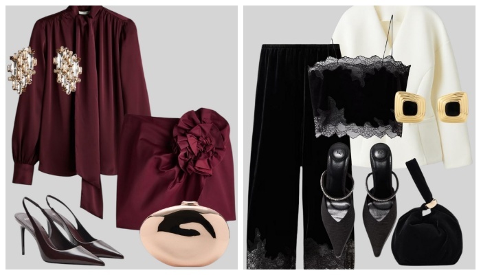 Новогодняя ночь — лучший повод позволить себе немного больше блеска, играть с фактурами и смело сочетать элегантность с праздничным настроением. Представленные образы идеально передают эстетику торжества: бархат, пайетки, крупные украшения, глубокие оттенки и акцентные аксессуары. Эти сеты помогут подобрать стильный и продуманный наряд, который будет выглядеть гармонично и празднично. Черный цвет никогда не выходит из моды. Бархат, атлас, кружево и кожа создают насыщенное и дорогое звучание даже в полностью черной гамме. Образ, сочетающий бархатный кроп-топ с эффектным бантом и широкими брюками с кружевной отделкой, идеально подходит для вечера с шампанским и свечами — женственный, но при этом комфортный. Лаконичные черные лодочки и структурированная мини-сумка завершают ансамбль, подчеркивая графичность силуэта. Не менее выразителен образ с коротким черным платьем и массивными жемчужными серьгами. Высокие замшевые сапоги и сверкающий ободок на голову создают современный, но очень пр