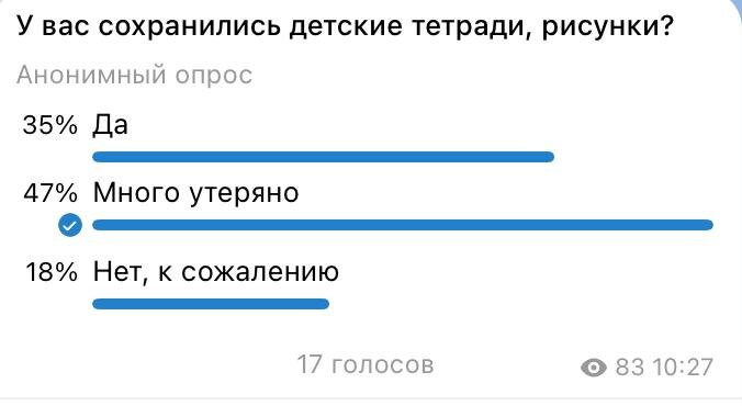 Когда я смотрела на результаты нашего опроса, мне вдруг вспомнились те старые картонные коробки, которые мы осторожно и с легкой улыбкой открываем спустя годы. В них когда-то лежали неумелые, трогательные, с огромными солнцами и домиками детские рисунки, тетрадки, маленькие каракули на листочках и аппликации. 🎨🚘🙂🌸🐰🌲✈️🌈💭🏠🌳 ☀️У кого-то из вас такие коробки до сих пор хранятся на верхних полках шкафов. 💌У кого-то они исчезли между переездами, сменами городов, взрослыми заботами. 🗯У кого-то так и не появились. Удивительно, но именно эти маленькие вещи помогают нам вспомнить себя прежних. Если у вас есть дети или внуки, попробуйте начать складывать в одну папку их маленькие творческие и школьные работы. Пусть там будет всё: странные человечки, незаконченные поделки, листы с кривым почерком, первые фразы, записки. Через годы они пр