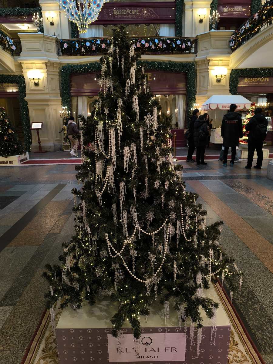 Среди посетителей ГУМа очень много туристов-мусульман с Ближнего Востока. Удивительна разница наших культур. Они вообще не реагируют на новогодние ёлочки. Им интересно всё что угодно -- мороженое ГУМа, Дымковские игрушки, которыми украшен магазин, сувениры в сувенирных лавках, от которых они в восторге... НО вот ёлки не интересны. Нет.