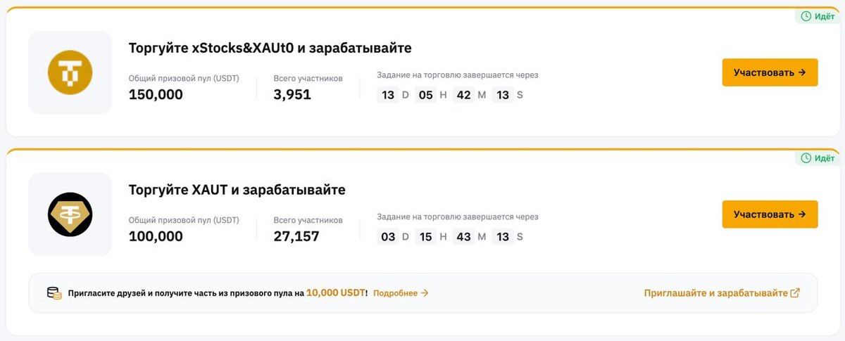 ΠΏΠΎΠ»ΡΠ·ΠΎΠ²Π°ΡΠ΅Π»Π΅ΠΉ) 1. Π’ΠΎΡΠ³ΠΎΠ²Π°ΡΡ ΡΠΎΠΊΠ΅Π½Π°ΠΌΠΈ xStocks ΠΈ XAUt0 Π½Π° ΡΡΠΌΠΌΡ Π½Π΅ ΠΌΠ΅Π½Π΅Π΅ 500 USDT Π² Bybit Alpha 2. ΠΠ°Π±ΡΠ°ΡΡ Π΄ΠΎ 700 USDT Π½Π° Π°ΠΊΠΊΠ°ΡΠ½Ρ - Π²ΡΠ΅ Π±ΡΠ΄Π΅Ρ Π·Π°Π²ΠΈΡΠ΅ΡΡ ΠΎΡ ΠΎΠ±ΡΠ΅ΠΌΠ° ΡΠΎΡΠ³ΠΎΠ² β ΠΠΊΡΠΈΡ 2 - 100,000 USDT (Π΄Π»Ρ Π²ΡΠ΅Ρ