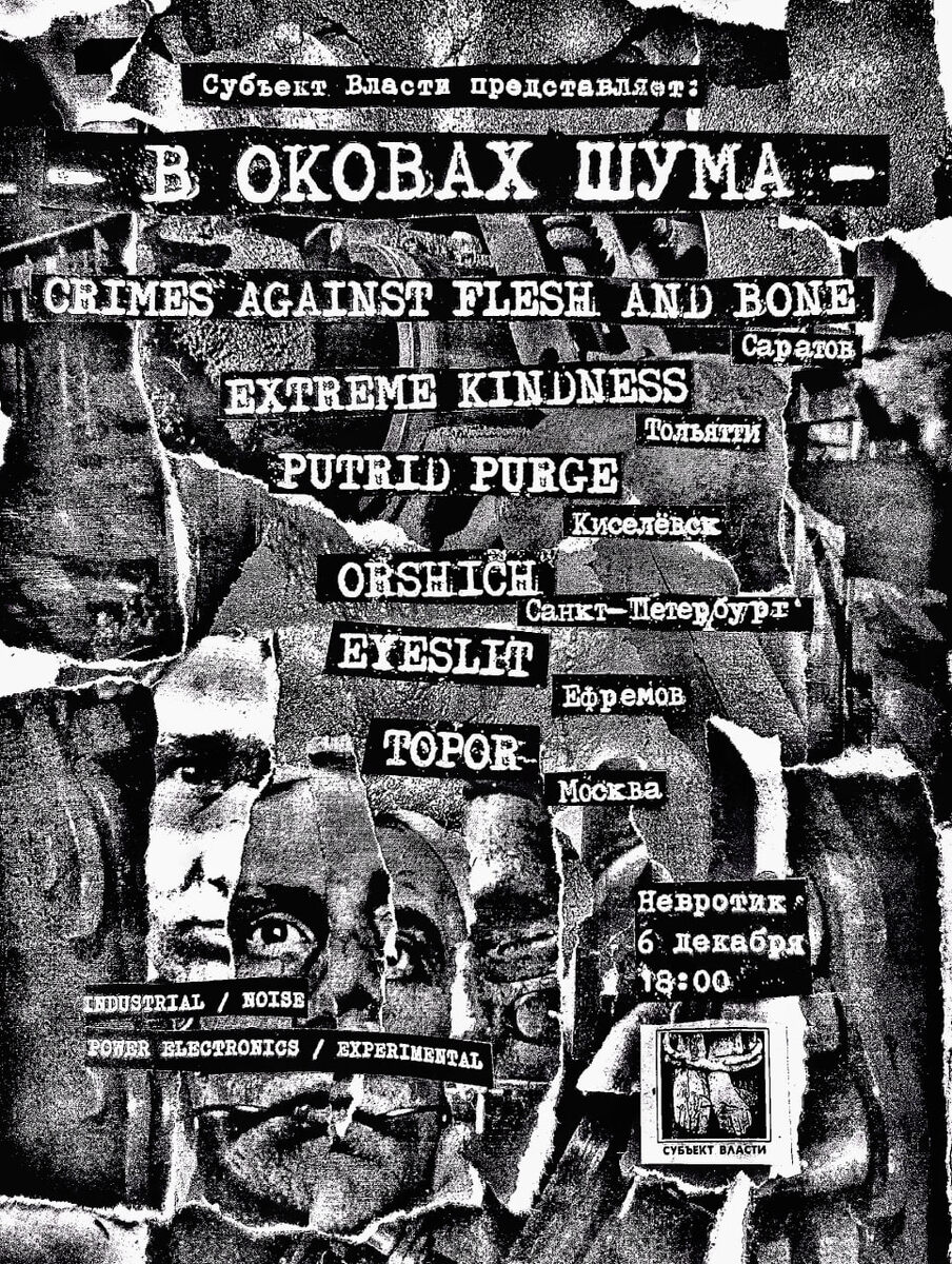 Москва ● Невротик ● 06.12 (Сб) ● 18:00 #noise ► В Оковах Шума ● VK Процессы постижения действительности включают виды, уровни, методы и формы. Исследование звуком - метод, в который мы приглашаем пытливый ум в этот вечер. Участники: ► Topor ● VK ► Eyeslit ● VK ► Orshich ● VK ► Putrid Purge ● VK ► Extreme Kindness ● VK ► Crimes Against Flesh And Bone ● VK Билеты от 1200₽