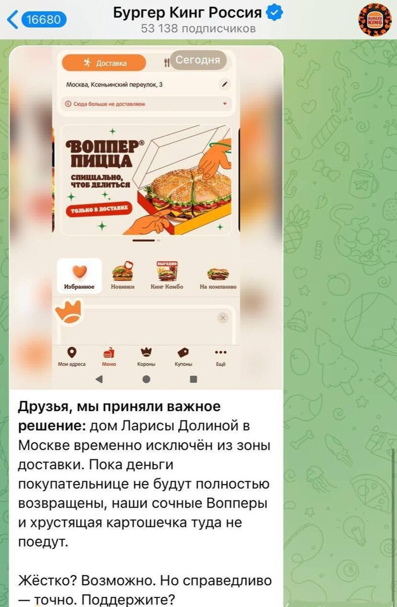 🙀Ларисе Долиной отказали в доставке фастфуда в её московскую квартиру