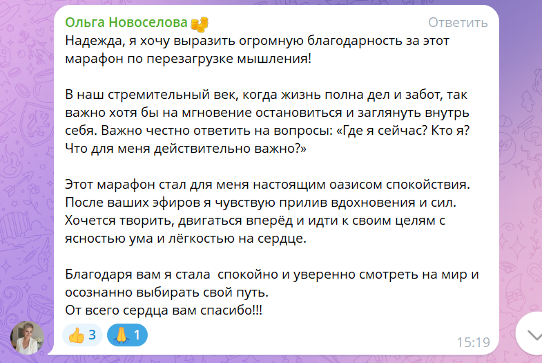 Две недели назад я запустила марафон «Перезагрузка мышления» и это стало настоящим путешествием в мир новых открытий и инсайтов. Мы шаг за шагом разбирали темы, которые действительно меняют взгляд на жизнь и финансы: — Проблемные установки, которые блокируют рост — Осознанное мышление: как найти точку старта для перемен — Выход из зоны комфорта без стресса — Финансовый интеллект и “перепрошивка” кода богатства — Личные цели, привычки и работа с внутренними блоками — Методы быстрого внедрения новых знаний в ежедневную жизнь Каждый день марафона был не просто информацией “для галочки”, а настоящей практикой: люди делились своими открытиями, меняли мышление и даже принимали важные решения по ходу марафона. В отзывах участники рассказывают о настоящих инсайтах, о том, как взглянули иначе на привычные вещи, перестали бояться перемен и начали формулировать новые финансовые цели. Скрины их мнений прилагаю реальный опыт, без фильтров. Почему марафон “Перезагрузка мышления” так важен? Потому ч