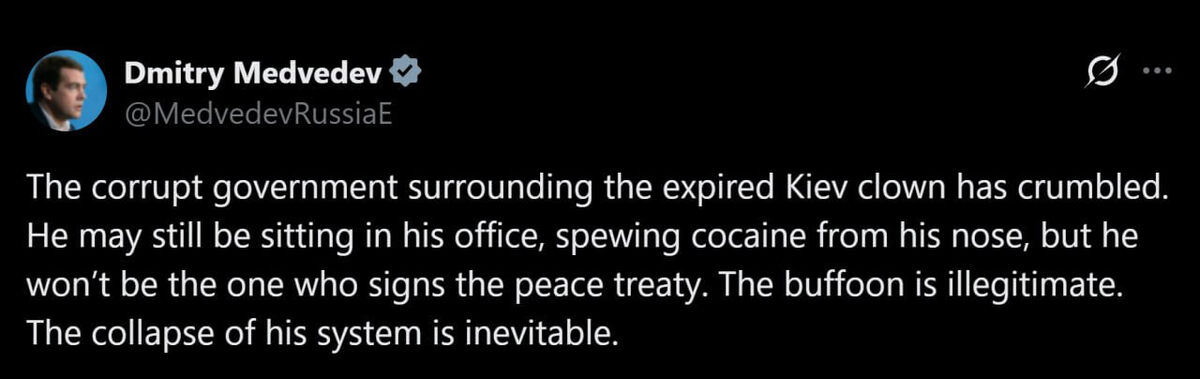 Medvedev unloads on Zelensky after the shake-up in Kiev, calling him an 'expired clown' Says Zelensky WILL NOT be the one to sign the eventual peace treaty 'The collapse of his system is inevitable'