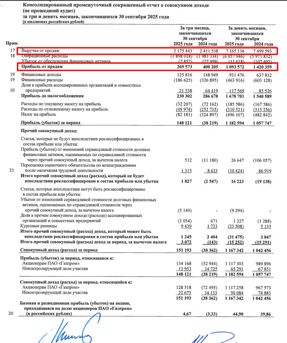1) Выручка от продаж за квартал составила 2,18 трлн. рублей, снизившись год к году на 9,80%. Выручка за 9 месяцев составила 7,17 трлн. рублей. Снижение на 4,50%.