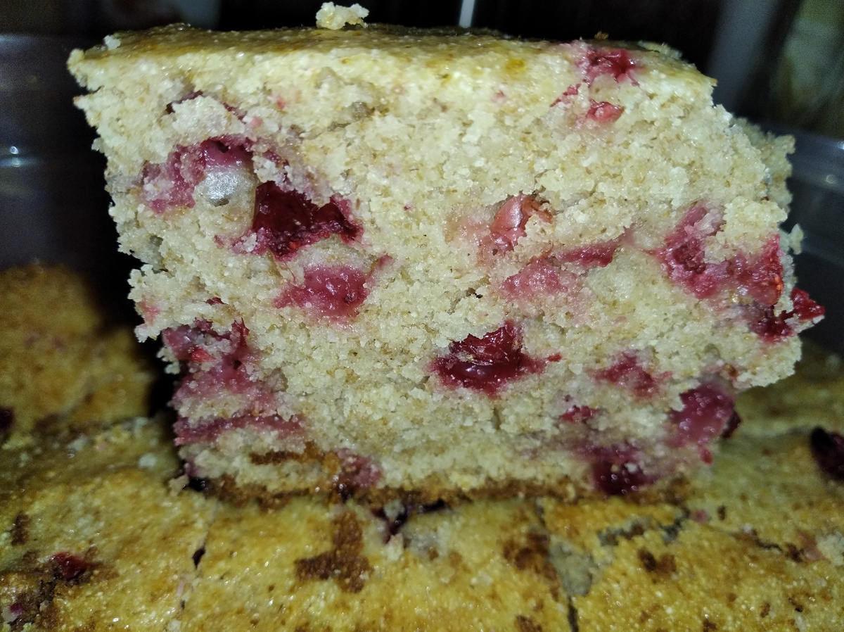 Был конец месяца, обычная мука у меня закончилась, а что-то испечь хотелось, поэтому готовлю манник из цельнозерновой муки. Думаю, что следующими этапами будет замена молока на растительное, сахара на сахаро-заменитель, а манную крупу на крупу из твердых сортов. А сегодня я готовила из таких продуктов: -манная крупа ( обычная) 1 стакан, -молоко 1 стакан, -мука цельнозерновая 1,5 стакана, -сахар 1 стакан. Стакан должен быть грамм 250. Сюда же: -соль и ванилин по щепотке, -две чайные ложки разрыхлителя, -подсолнечное масло половина стакана. Все смешала, как обычно, в миске, тесто получилось довольно густое. Для начинки взяла замороженную бруснику 150 грамм, смешала со столовой ложкой крахмала. Ягоды высыпала аккуратно в тесто, не высыпая в него излишки крахмала, перемешала. Все перелила в форму для выпекания, покрытую пергаментом. Выпекаю сорок минут на температуре 180 градусов, Вы смотрите по своей духовке, ориентир для меня румяная корочка сверху и не подгорелый низ) Вынимаю из духовки