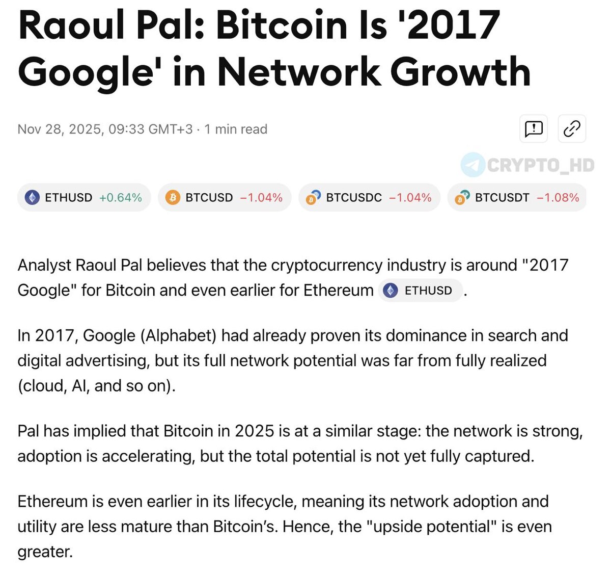 🤔 Биткоин сегодня напоминает Google в 2017 году. Известный аналитик Рауль Пал сравнил развитие Биткоина в 2025 году с Google в 2017 году, когда компания уже доминировала, но ее сетевой потенциал был реализован лишь частично. Главные мысли Пала: • BTC – зрелая, но все еще недооцененная сеть, где принятие растет быстрее, чем рынок успевает оценить. • ETH находится еще раньше в цикле, поэтому «апсайд» у него даже больше. • Крипта создает ценность через сетевые эффекты, как Google, Meta или Amazon. • По Закону Меткалфа стоимость сети увеличивается по мере роста числа пользователей, а не из-за прибыли. • Главное топливо роста – массовое принятие, а не финансовые показатели. Рауль Пал – один из самых влиятельных макроаналитиков в мире, бывший руководитель хедж-фонда в Goldman Sachs и сооснователь Real Vision. Автор концепции «банановых зон» на крипторынке – фаз стремительного роста, привязанных к циклам ликвидности. Ранее: мнение о коррекции BTC Crypto Headlines