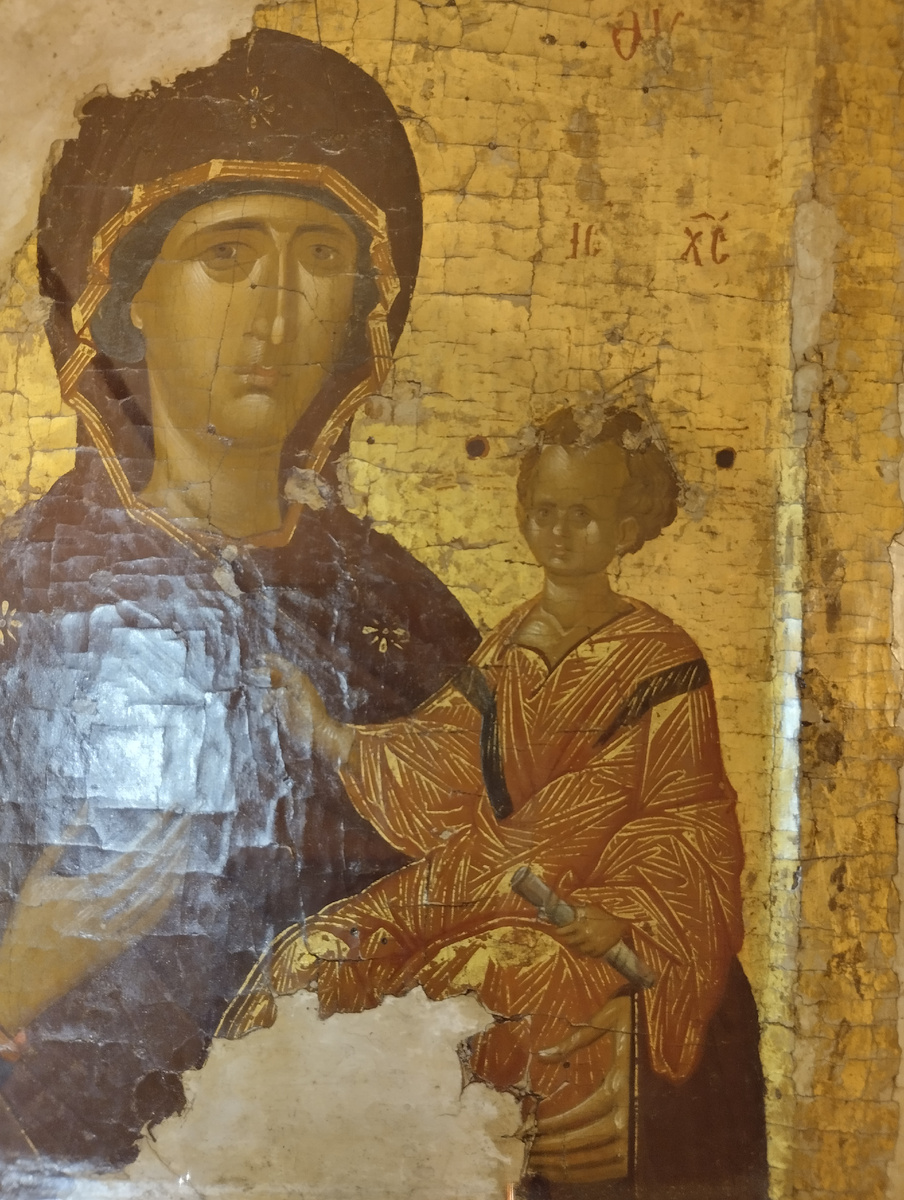 Происхождение предположительно византийское. Исследователи отмечают значительное сходство стиля иконы с памятниками начала XV столетия из монастыря Святой Екатерины на горе Синай, предполагая возможное происхождение иконы именно из этих мест. Первый известный владелец иконы — Пётр Иванович Севастьянов юрист, собиратель христианского искусства, приобрёл её в ходе путешествия по Ближнему Востоку и Египту в 1852 году вместе с коллекцией произведений искусства. Известно, что Пётр Иванович посещал и Святую Гору, и многие знаковые места для христиан, привозил большие коллекции для музеев России. Композиционные и художественные характеристики Размеры иконы составляют 35 × 28,5 см. Традиционный образ Богоматери изображён в холодных оттенках: мафорий окрашен в тёмно-вишнёвый цвет с сиреневым свечением, чепец и рукава хитона имеют глубокий синий оттенок. Рукава декорированы двумя золотыми полосами, вышитыми нитями золота, бахрома отсутствует. Три золотые звёзды на челе и плечах символизируют п