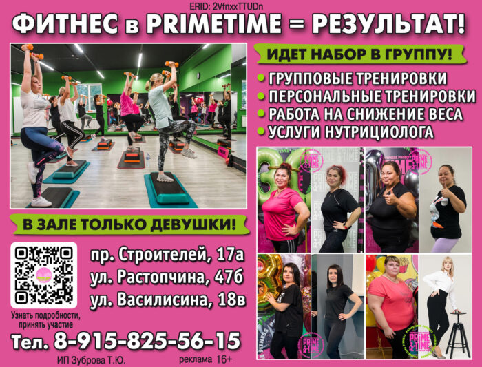 ФИТНЕС проект для женщин PRIMETIME открывает НАБОР НА НОВЫЙ СЕЗОН 2026 года! PRIMETIME = РЕЗУЛЬТАТ. Мы всероссийский бренд в сфере фитнеса и правильного питания уже 11 лет. Во Владимире проект успешно работает с 2017 года! За это время с проектом привели себя в форму тысячи девушек и женщин от 16 до 70-ти лет! Фото: В регионе-33 проект PRIMETIME работает с 2017 года Профессиональная команда.Современные методы работы.Женское комьюнити.Помощь и поддержка на всех этапах.Призы и подарки за лучшие результаты.И яркие эмоции ГАРАНТИРОВАНЫ. И помните – В ЗАЛЕ ТОЛЬКО ДЕВУШКИ! Фото: В зале только девушки ✔ИДЕТ НАБОР В ГРУППЫ по адресам в городе Владимире: Проспект Строителей, 17аУл. Растопчина, 47бУл. Василисина, 18в Выбирай, что тебе удобнее всего и создавай новую версию себя вместе с PrimeTime. ✔ГРУППОВЫЕ ТРЕНИРОВКИ✔РАБОТА НА СНИЖЕНИЕ ВЕСА✔УСЛУГИ НУТРИЦИОЛОГА✔ПРОГРАММА ОНЛАЙН Подробнее о проекте PrimeTime в нашей группе ВК. Телефон для связи: 8-915-825-5615 Маркировка рекламного материала ИП