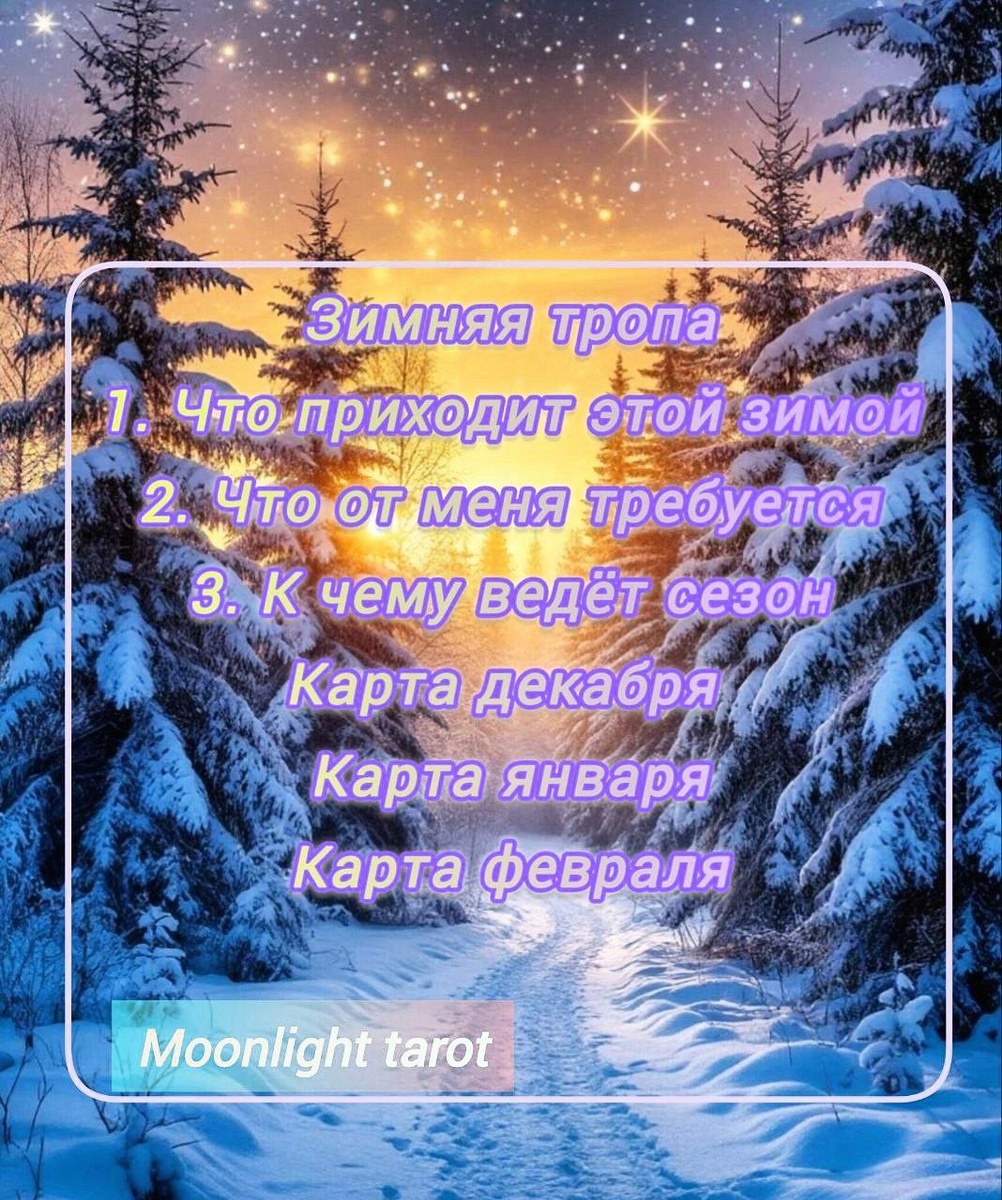 Приглашаю тебя пройти по «Зимней тропе» — раскладу, в котором слышен хруст первого снега и шёпот ветра между елями. ❄️ Это путь, где каждая карта — как след на белом снегу, указывающий направление, когда вокруг тишина и новые смыслы. Этот расклад покажет не только уроки, но и возможности, а также даст представление о том, как проявятся события к концу зимы. ПОЗИЦИИ РАСКЛАДА: 1️⃣ ЧТО ПРИХОДИТ ЭТОЙ ЗИМОЙ — энергия, урок, тема сезона; то, что естественно проявляется и формирует контекст. 2️⃣ ЧТО ОТ МЕНЯ ТРЕБУЕТСЯ — действия, внутренние решения или внимание, которое нужно проявить, чтобы пройти сезон осознанно. 3️⃣ К ЧЕМУ ВЕДЁТ СЕЗОН — итог, результат, то, что проявится к концу зимы. КАРТА ДЕКАБРЯ КАРТА ЯНВАРЯ КАРТА ФЕВРАЛЯ Сделай расклад сама или напиши мне @Alexandra_Ancelm — энергообмен: донат по сердцу ❤️🔥 Благодарность автору Сезон Стрельца Расклад ПЕРВЫЙ СНЕГ