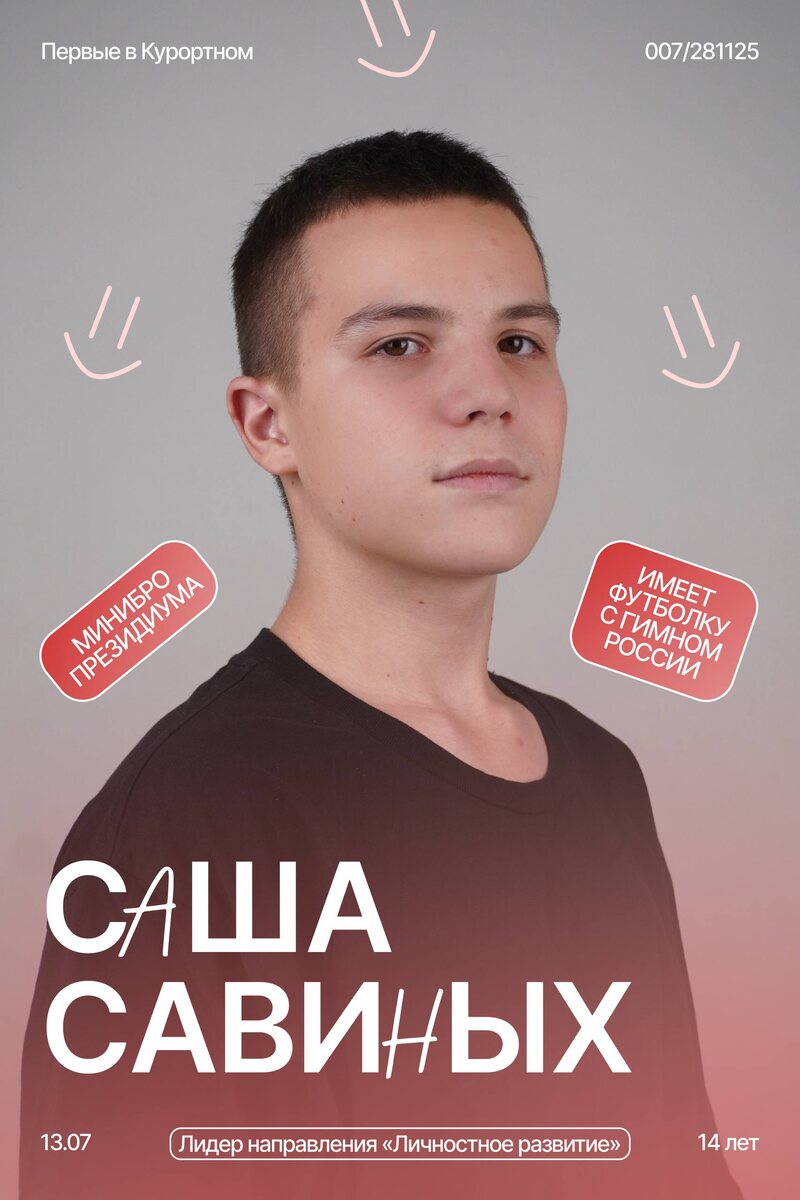 🔥 Знакомство с Курортным Во время серьёзной и продолжительной работы очень важно уметь отвлечься, отдохнуть или внести больше ярких идей в проект. ☀️ Эта миссия идеально подходит лидеру направления «Личностное развитие» Совета Первых — Саше Савиных! Он с особым успехом находит общий язык с каждым и обязательно заряжает энергией на весь оставшийся день своими шутками и жизнерадосностью. 🥳 Саша — самый юный член президиума, именно поэтому он с гордостью носит звание «Минибро Президиума». 🥹 Главным патриотом нашего коллектива точно можно назвать Сашу. Он ценит и чтит свою Родину, поэтому любит собирать необычные вещи с государственными символами. Например, у него есть футболка с гимном Российской Федерации. 🇷🇺 👅 Будь весёлым, будь в Движении! #ДвижениеПервых #ДвижениеПервыхСПб #ПервыеКурортный #ЗнакомствоСКурортным