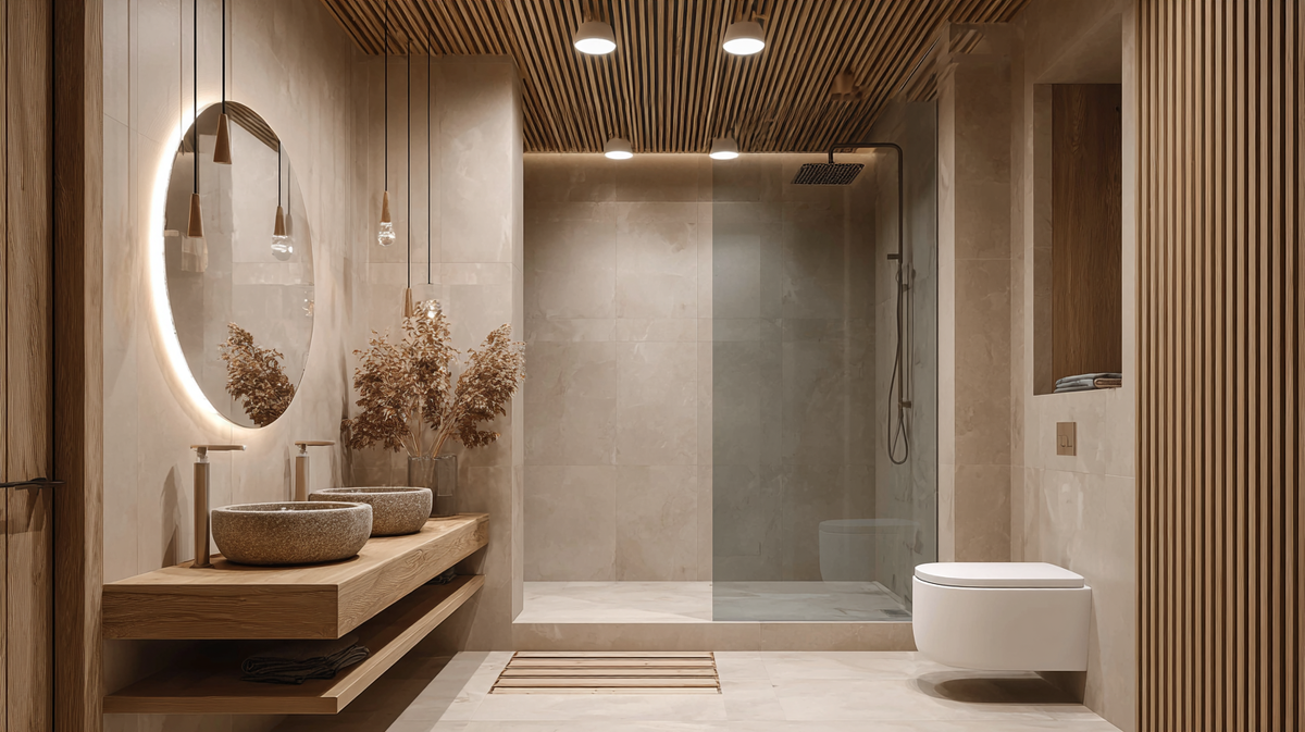 Здесь важно и то, и другое. Свет должен быть ярким, но не жёстким. Лучше всего — влагозащищённые встраиваемые споты с IP65 или IP67. Установите их над зоной душа или ванны, чтобы свет равномерно покрывал поверхность.