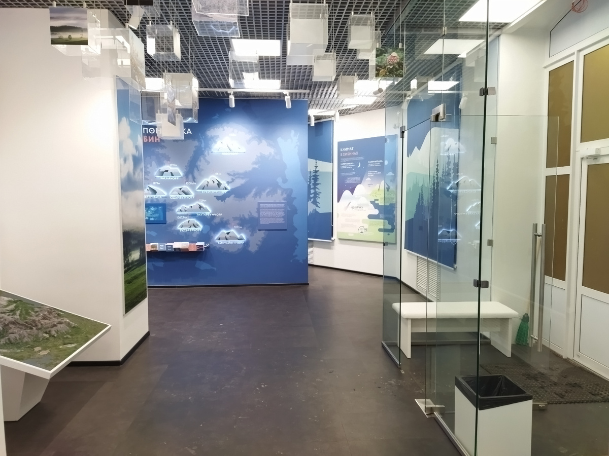 Фотография. Детская зона в музее "Хибинариум". На дисках показаны встречаемые в Хибинах природные зоны. После лесной зоны идут берёзовые криволесья. Берёзы растут кривые из-за тяжести снега, который наносит дефекты на стволы, вследствие чего они становятся кривыми. Такой же эффект наблюдается на Кавказе, но не с берёзами, а другими деревьями.