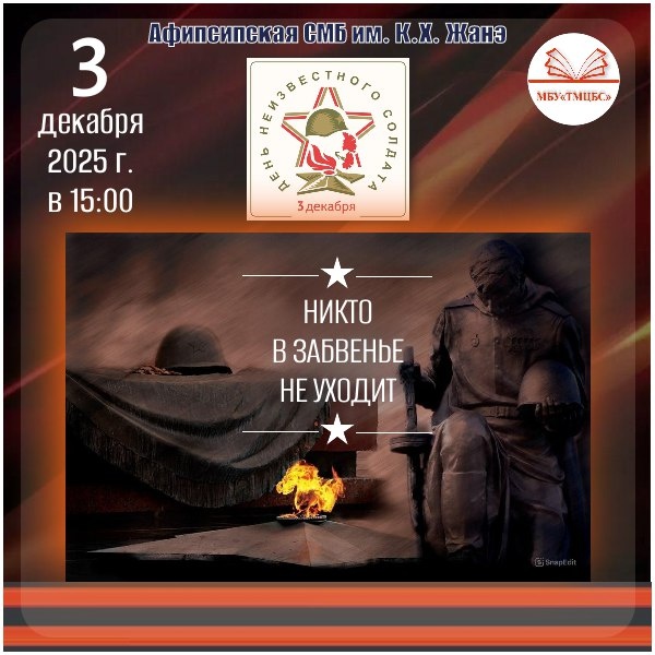 📢 Анонс. Тематический час «Никто в забвенье не уходит» 🗓 3 декабря 2025 г. ⏰ 15:00 – 16:00 📍 Афипсипская СМБ им. К.Х. Жанэ Приглашаем всех желающих на тематический час, посвященный Дню неизвестного солдата. Библиотекарь подробно расскажет о значимости мемориала, который увековечивает память о солдатах, ушедших на фронт и не вернувшихся домой. Вы узнаете об истории возникновения памятников неизвестным солдатам, о трудностях, связанных с их созданием, а также увидите уникальные кадры документальной кинохроники, которые помогут глубже понять значение этого события. Вместе вспомним наших земляков, аульчан, которые сражались за нашу Родину против немецко-фашистских захватчиков и пропали без вести. Наша задача — сохранить их память в наших сердцах и передать её будущим поколениям. В завершение мероприятия мы почтим память всех солдат, пропавших без вести, минутой молчания.