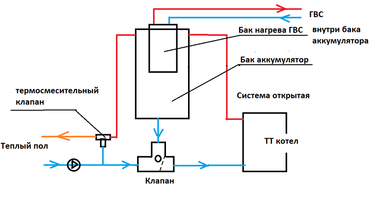 От ТТ котла к газу и совместно Часть 1. Что было. До подключения газа отапливал свой дом дровяным котлом. Такую трудность, как подогрев ночью решил массивный слой стяжки теплого пола. Тепла до утра хватало, ну или почти хватало. А вот проблему с отключением электричества, когда при отключении насоса котел очень быстро вскипал (или при отказе работы насоса) пришлось решать. Решил по следующей схеме: Особенность схемы в клапане с шаром небольшой положительной плавучести. При работе насоса шар поднят плавучестью и давлением потока и перекрывает циркуляцию обратки из бака. Насос гонит воду через котел по большому кругу в верхнюю часть бака и далее на расход. Выключился насос – начинается естественная циркуляция по малому кругу. Клапан отходит и пропускает обратный поток. Бак теплоаккумулятор был выполнен из 200 л бочки. Его объёма вполне хватало, чтобы принять тепло от оставшихся в топке дров. Но если успеете лучше закрыть подачу воздуха, пусть тлеют. Рекомендую открытую систему. В слу
